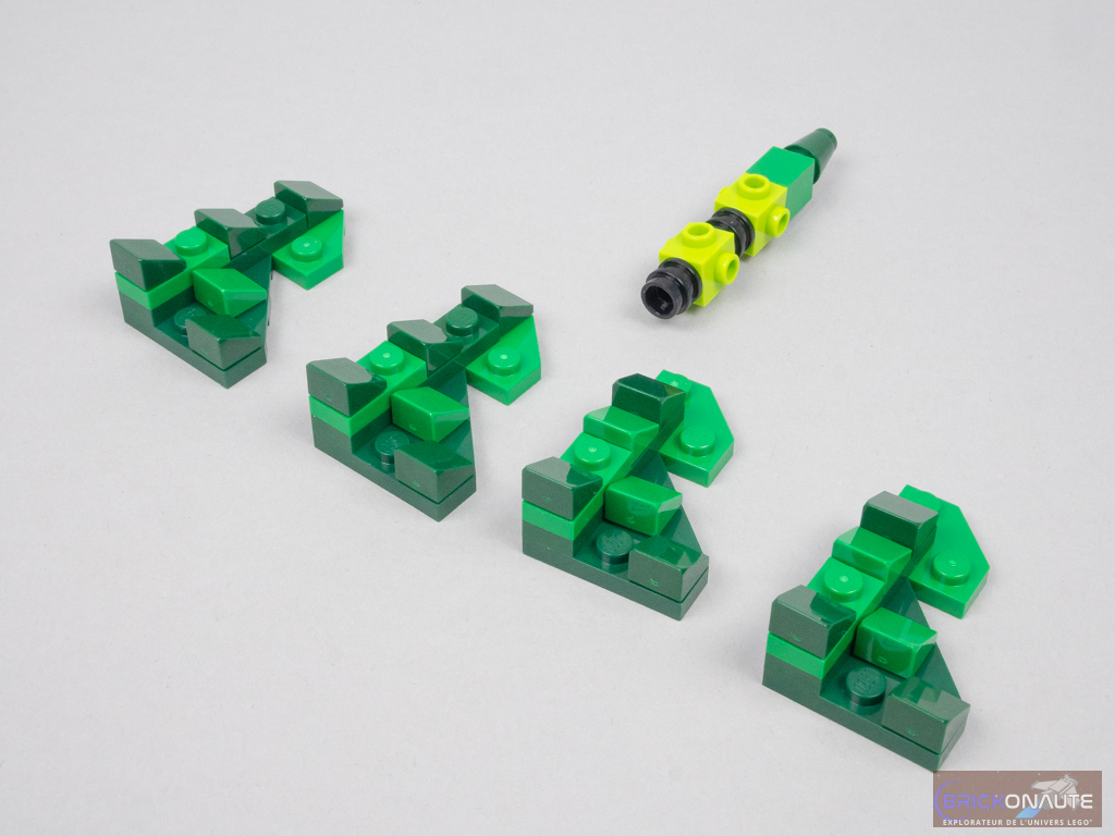 La construction commence par les petits assemblages « annexes ». Et plus en particulier par le sapin qui utilise une technique vue et revue dans ces sets saisonniers : une structure interne avec quelques briques SNOT, sur laquelle on vient fixer 4 sous-assemblages pour former le feuillage.