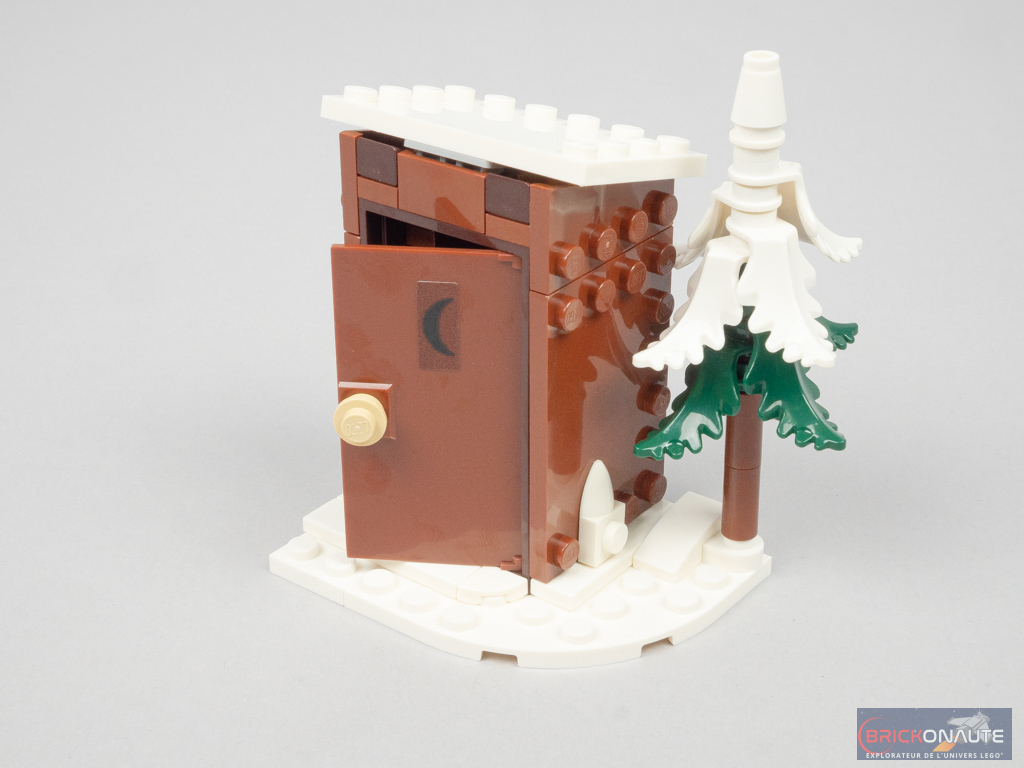 La troisième construction concerne les toilettes extérieures, dont les murs de bois sont fixés sur des briques SNOT et le toit sur une charnière. À l’intérieur, le « trône » est simplement constitué de quelques éléments tan – on fixe un joli sapin sur le côté.