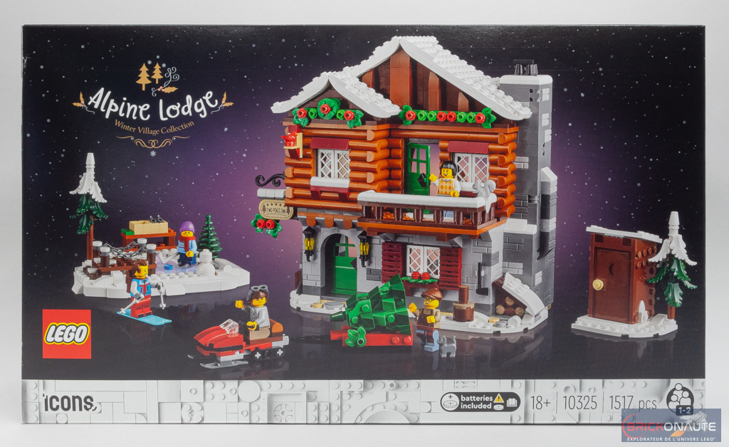 Sur la face avant de la boîte à la livrée noire habituelle des sets de la gamme LEGO Icons, notre set est mis en scène vu de face avec les différentes minifigs vaquant à leurs occupations. Au dos, on découvre l’intérieur du chalet et quelques images de détail. On apprend que le set contient une brique lumineuse, ici destinée à éclairer le feu de cheminée.