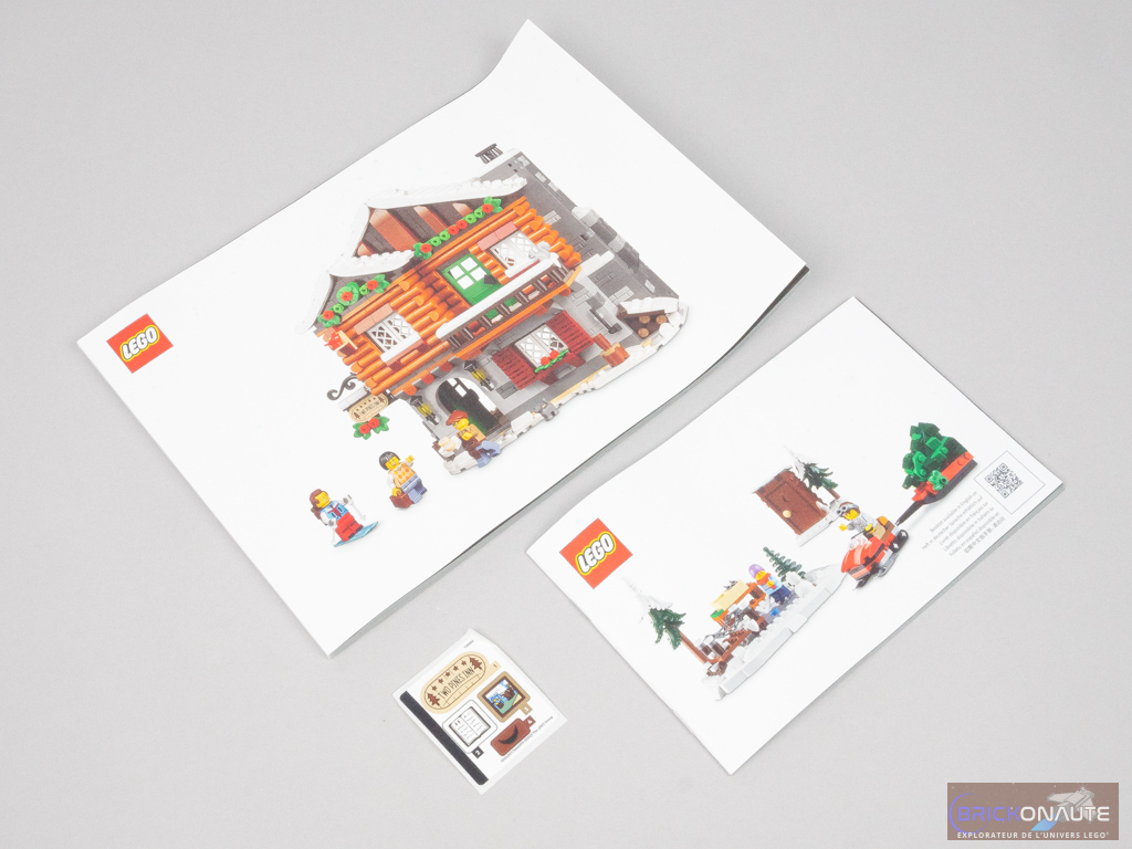 À l’intérieur de la boîte, on trouve 10 sachets de pièces numérotés, en plastique. Je me demande quand LEGO se décidera à nous fournir les sachets en papier promis il y a bien longtemps et toujours absents à quelques rares exceptions près. Il y a également deux notices d’instructions, on pourra donc partager la construction avec quelqu’un même si ce ne sera pas très équitable : la petite notice ne propose la construction que des petites constructions annexes, quand la plus grande est dédiée au chalet lui-même. Enfin, on trouve aussi une petite planche de 4 autocollants, rien de bien méchant.