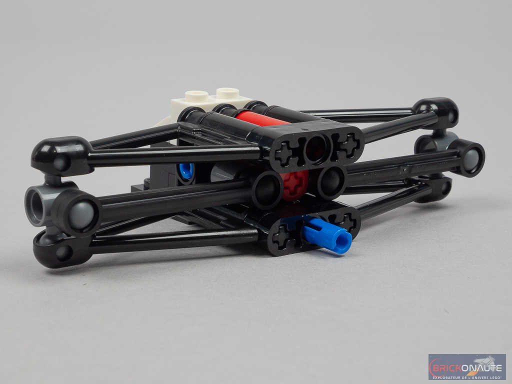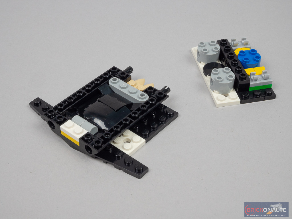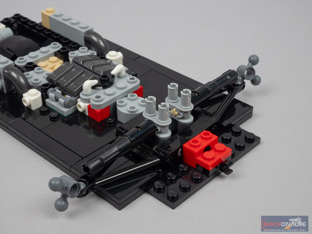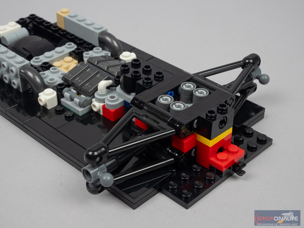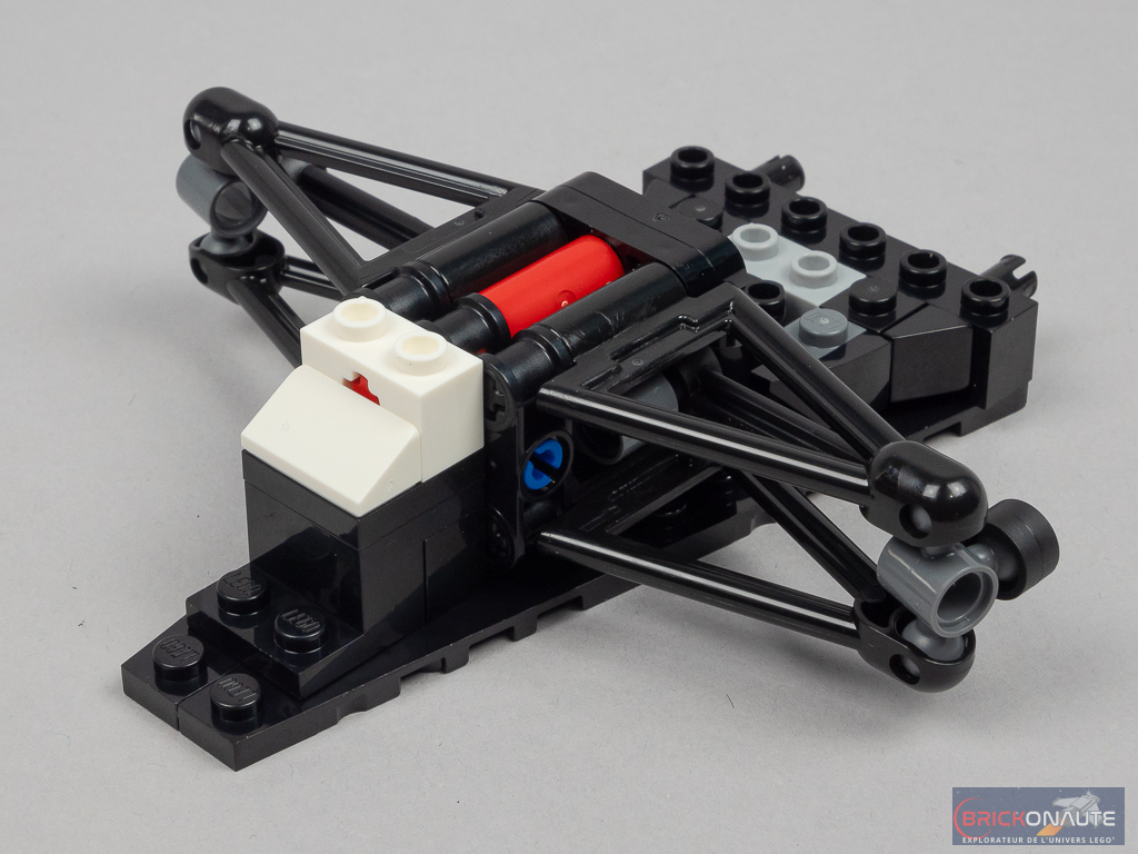 On construit ensuite un premier sous-ensemble avec l’axe de rotation et la partie basse des suspensions du train arrière, fixé par deux pins sur le châssis. Un deuxième sous-ensemble similaire vient se placer au-dessus. On s’occupe alors des faces latérales du cockpit avec deux sous-ensembles symétriques fixés sur des briques SNOT et quelques détails supplémentaires pour le moteur.
