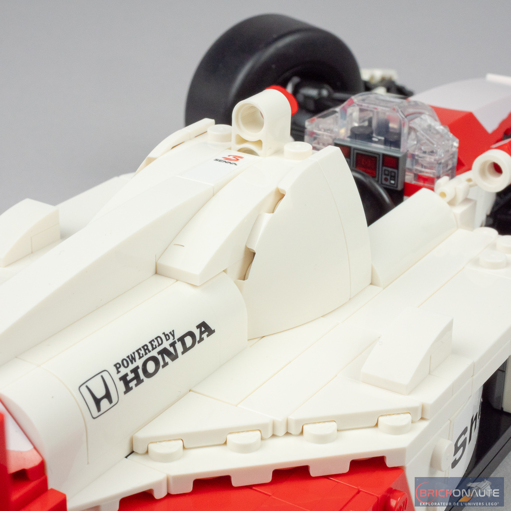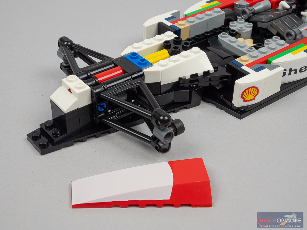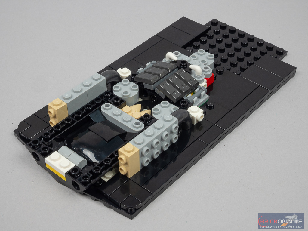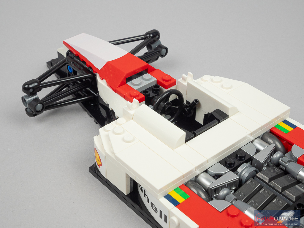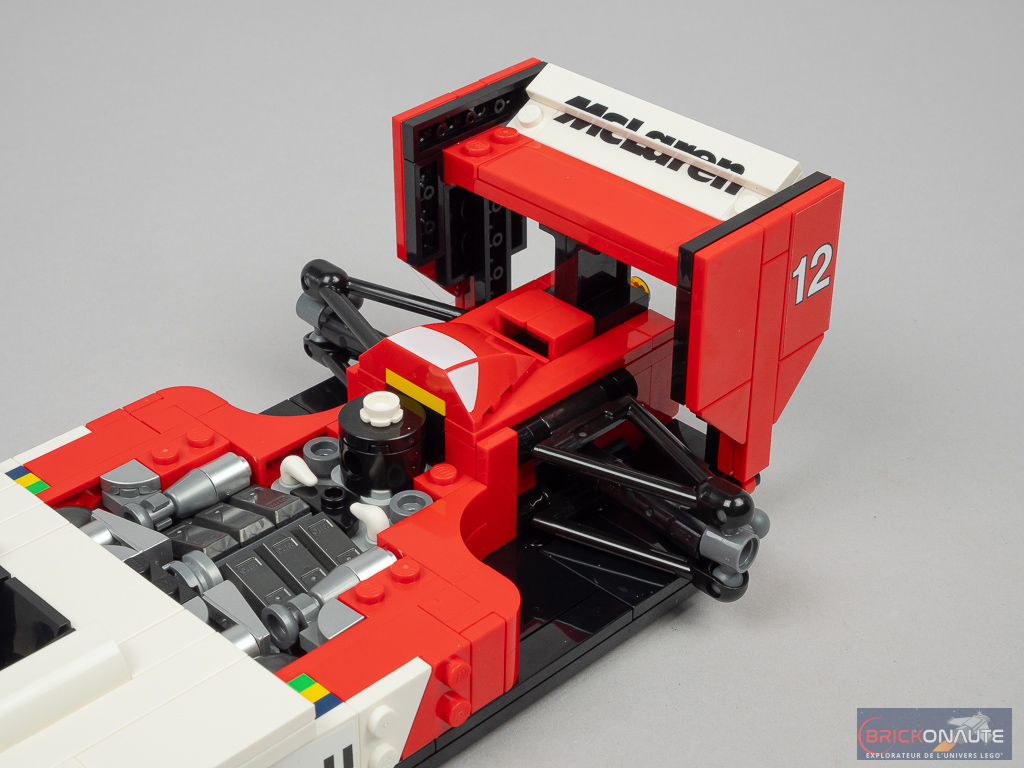 L’aspect très « plat » de la machine sur les côtés du cockpit se prêtait plutôt bien à une réinterprétation en LEGO et c’est ici bien fait. D’une manière générale, les formes et courbes sont bien reproduites. Seul petit regret sur les formes le « nez » pointu de la machine originelle est ici tout plat au niveau de la connexion à l’aileron avant. L’intégration d’un support d’exposition est une bonne idée et permettra l’observation plus aisée de la machine – le support est d’ailleurs décoré d’un autocollant avec les caractéristiques et le palmarès de la McLaren.