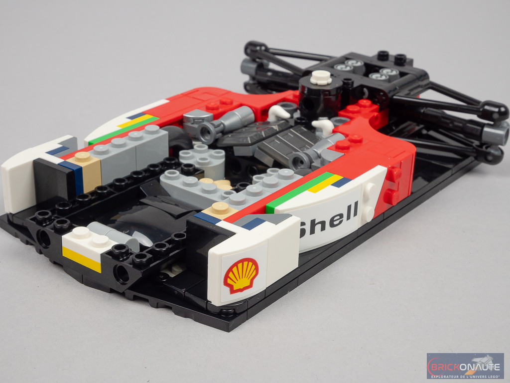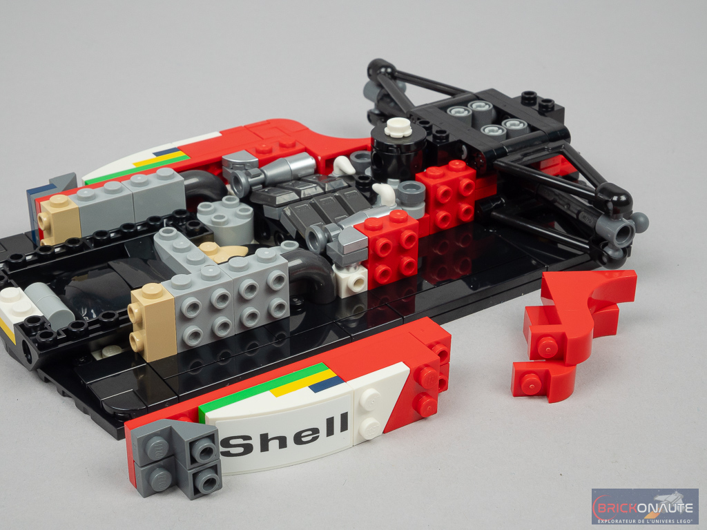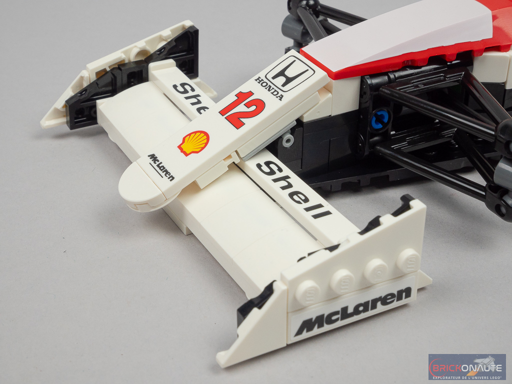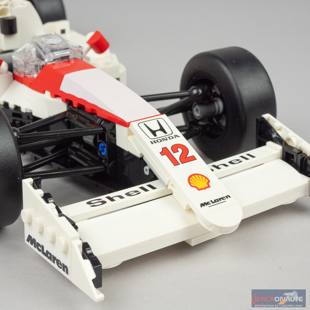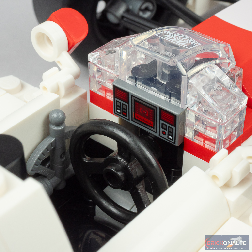 L’aspect très « plat » de la machine sur les côtés du cockpit se prêtait plutôt bien à une réinterprétation en LEGO et c’est ici bien fait. D’une manière générale, les formes et courbes sont bien reproduites. Seul petit regret sur les formes le « nez » pointu de la machine originelle est ici tout plat au niveau de la connexion à l’aileron avant. L’intégration d’un support d’exposition est une bonne idée et permettra l’observation plus aisée de la machine – le support est d’ailleurs décoré d’un autocollant avec les caractéristiques et le palmarès de la McLaren.