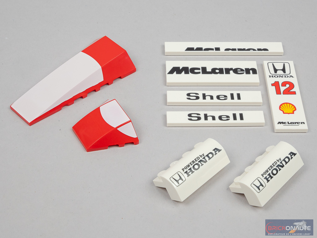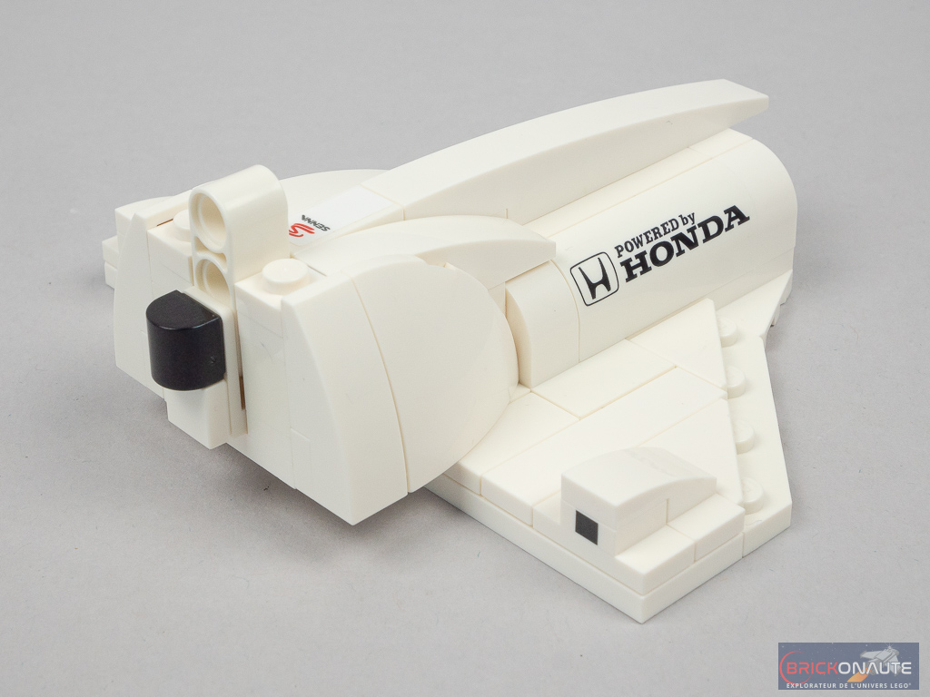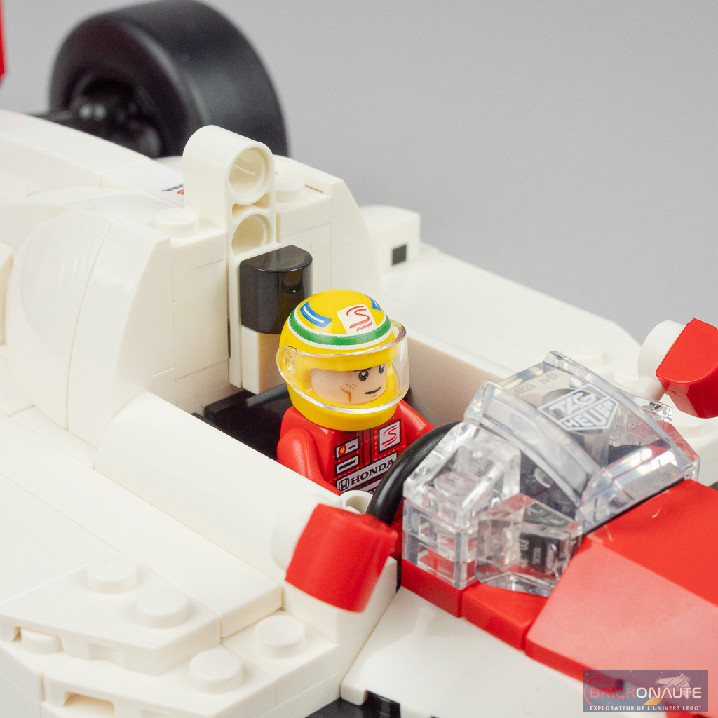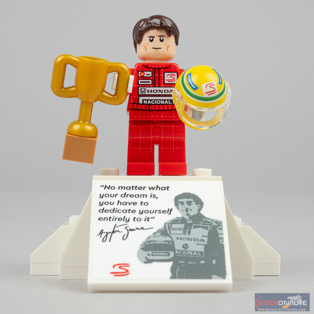 Si deux pilotes (Ayrton Senna et Alain Prost) ont piloté la voiture, seul le premier a les honneurs de cette boîte – dommage pour nous mais il faudra se contenter du brésilien. Sa réalisation est un sans-faute avec sa jolie combinaison de pilote et son superbe casque tampographié. Il est d’ailleurs présenté sur un joli support brick-built décoré d’un autocollant avec une citation de sa part.