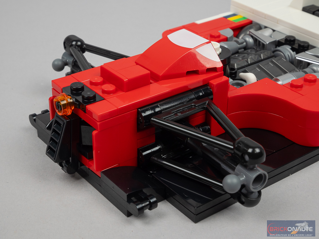 La construction est intéressante de bout en bout, telle qu’on est en droit de l’attendre d’un set de cette gamme dédiée à un public adulte. Elle met à profit les nouveaux éléments LEGO introduits pour l’occasion et est ponctuée de quelques « techniques » intéressantes. Comme c’est désormais la norme avec les voitures de la gamme LEGO Icons, la direction est fonctionnelle et renvoyée vers le volant. Les suspensions sont cependant un peu « raides » à mon goût (elles reposent sur une déformation des pièces triangulaires, aucun ressort ici).