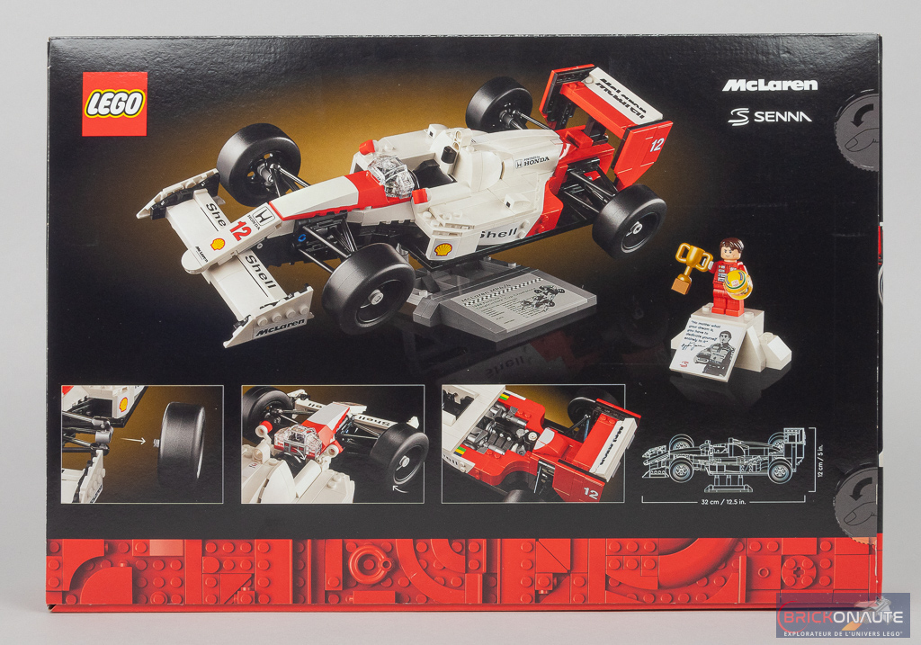 Le boîte est plutôt petite pour une voiture de la gamme LEGO Icons. Sur sa face avant, elle nous propose une première vue de la McLaren MP4/4, accompagnée de la minifig d’Ayrton Senna sur un petit support d’exposition décoré d’un autocollant. Au dos de la boîte, la voiture nous est présentée sur son support d’exposition. Quelques vignettes nous montrent les principaux détails, et un schéma nous précise ses dimensions : 32cm de long pour 12cm de haut, support inclus.