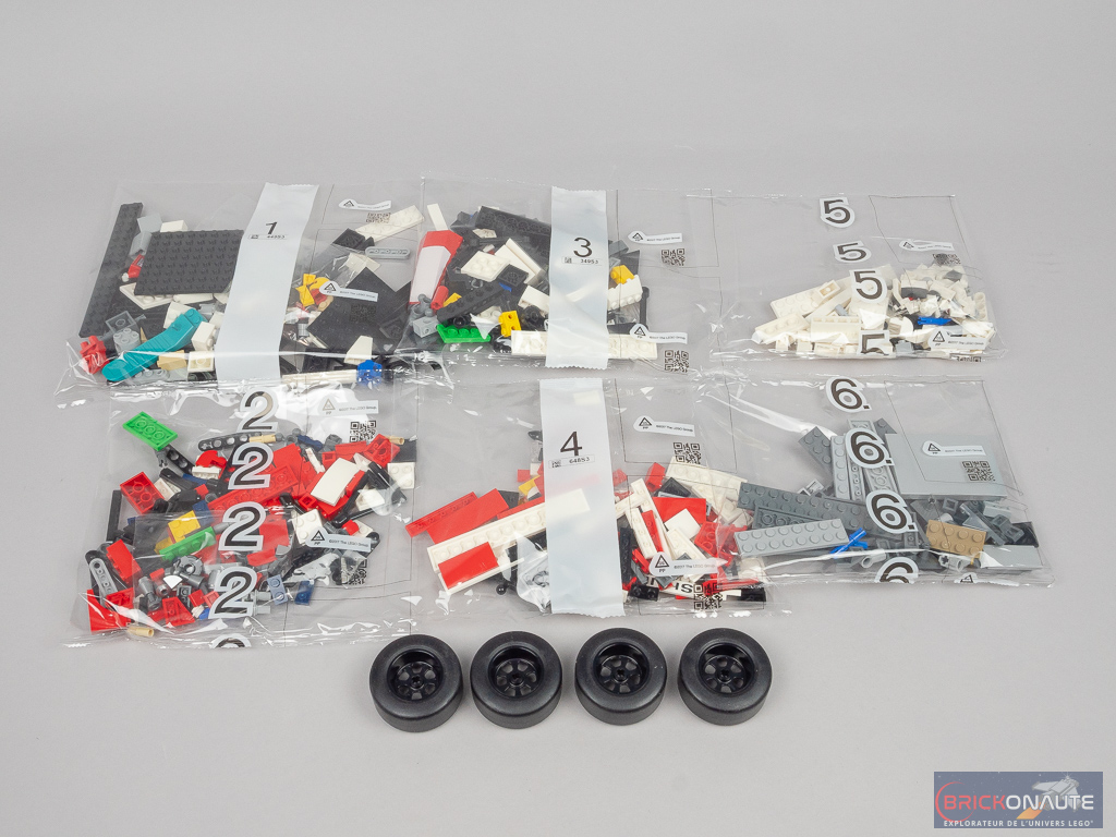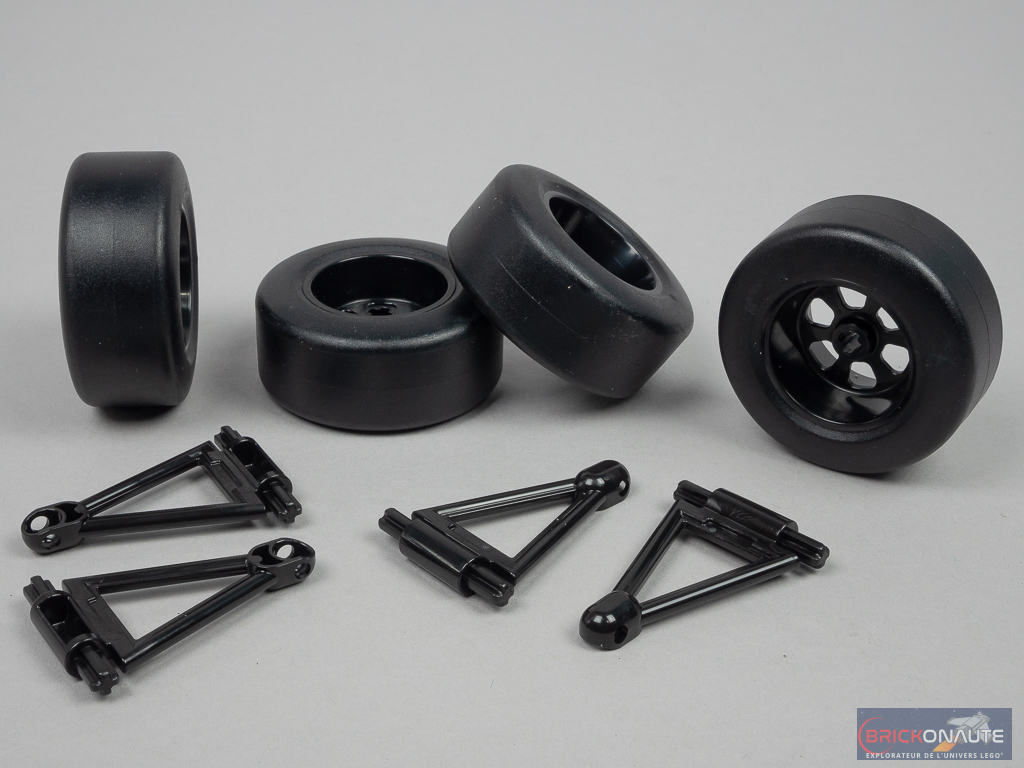 Du côté de l’inventaire, on remarquera évidemment les 4 roues avec leurs pneus rigides, de nouvelles pièces pour les triangles de suspension, et quelques éléments tampographiés – dommage que LEGO n’ait pas poussé l’effort plus loin et nous propose des autocollants dans cette boîte dédiée aux collectionneurs.