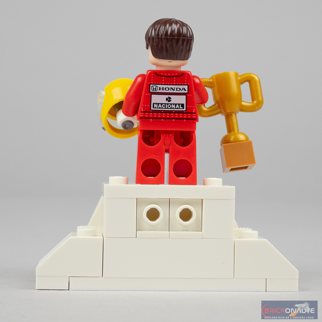 Même si la voiture n’est pas à l’échelle minifig, il y en a bien une de fournie dans cette boîte avec Ayrton Senna dans sa tenue de pilote. On construit également un petit « podium » pour pouvoir l’exposer à côté de la voiture. La réalisation est exemplaire avec l’intégration de nombreux sponsors (malgré la disparition, compréhensible, d’un célèbre cigarettier américain), sur la combinaison mais également sur le casque très joliment tampographié. Hormis la coiffure, tous les éléments de la minifig sont inédits.
