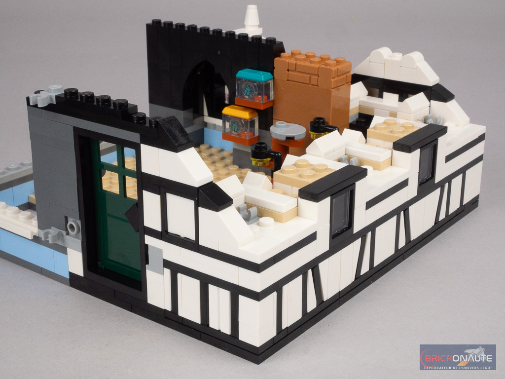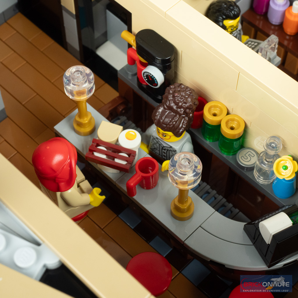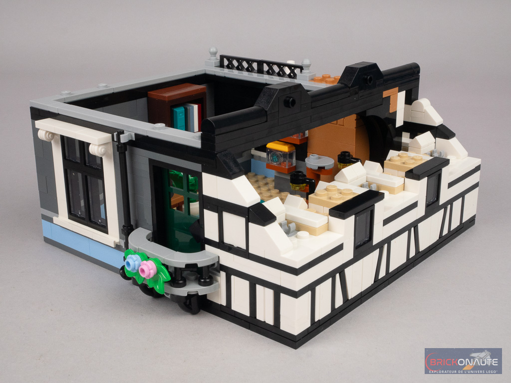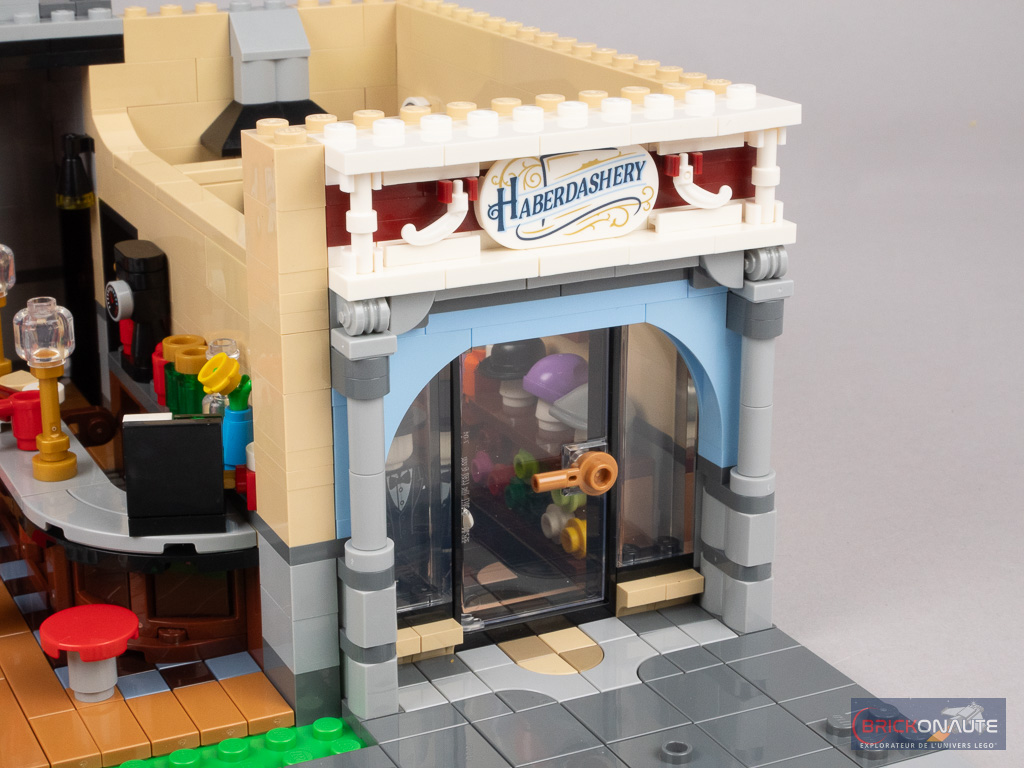 L’autre originalité de ce set c’est qu’il propose en fait la construction de 2 bâtiments aux styles bien différents sur une seule et même baseplate : celui qui contient le restaurant au rez-de-chaussée, et l’autre qui abrite la cuisine et la mercerie. Vu de l’extérieur, le design donne même l’impression que les étages sont de hauteurs différentes entre les deux bâtiments. Alors qu’à l’intérieur, pour l’atelier d’horlogerie du premier étage et l’appartement du second, tout est bien situé au même niveau.