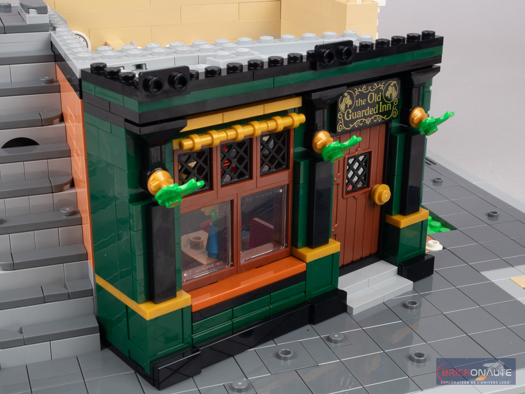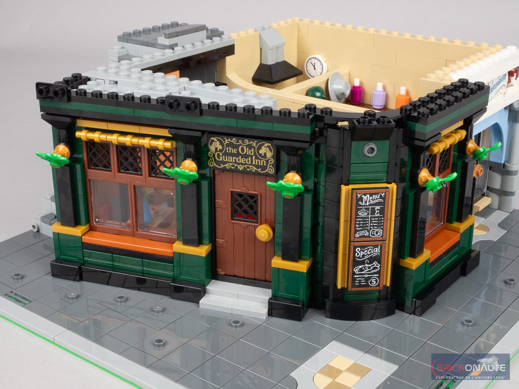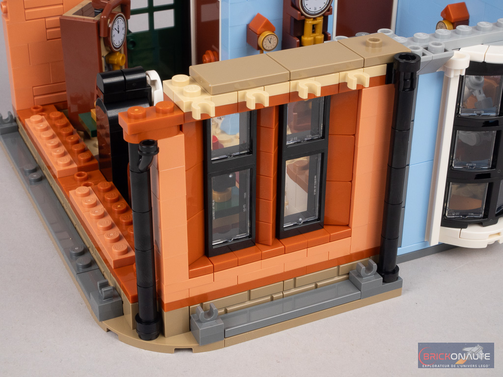 Le niveau de détail extérieur est digne de ce qu’on attend de ces sets destinés à un public adulte avec un joli travail sur les textures, de la variété dans les huisseries, des gouttières, de la végétation, des rambardes décorées, une petite terrasse, des stores ou encore une très belle enseigne pour l’horloger. Même le trottoir bénéficie d’un traitement de faveur avec une petite « fantaisie » : un blason incrusté.
