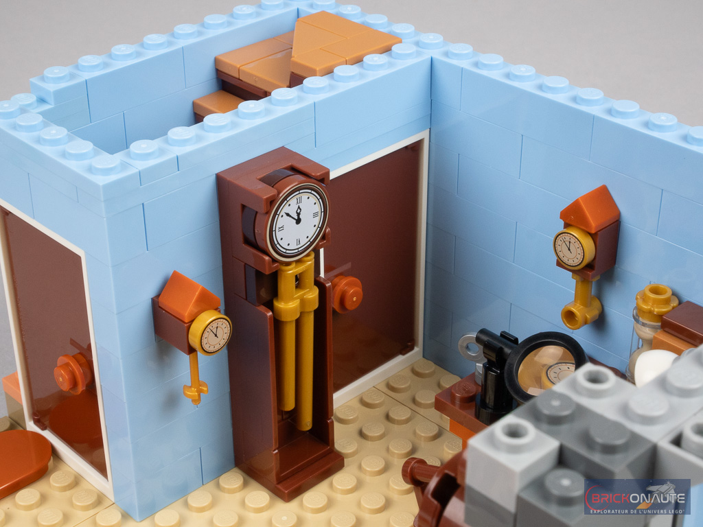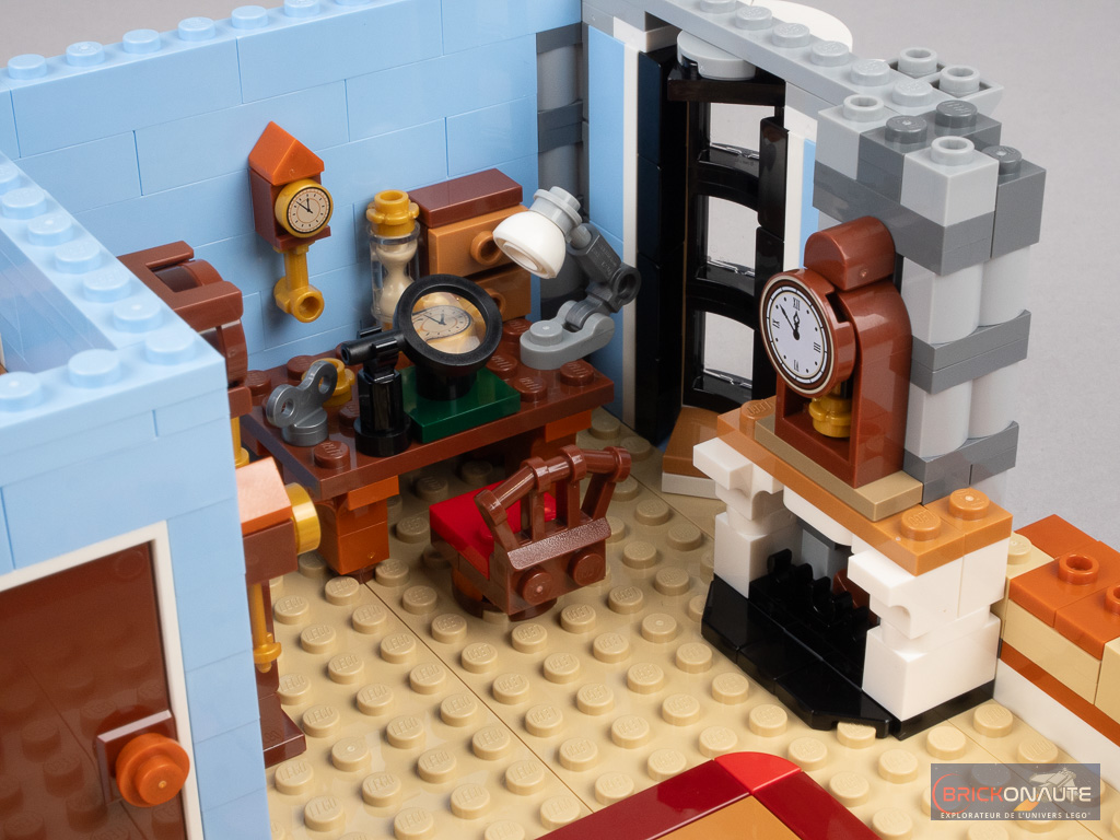 L’escalier extérieur permet d’accéder à l’atelier d’horlogerie, à l’intérieur duquel se trouve une porte permettant d’accéder à un autre escalier (joliment ouvragé, dommage qu’il soit caché) menant au 2ème étage. Son occupant n’aura d’autre choix que de passer par l’atelier avant de rentrer chez lui ! Je le disais un peu plus haut, ce set joue avec les échelles : bien qu’il s’agisse de 2 bâtiments côté extérieur, l’atelier d’horlogerie et l’appartement occupent bien la totalité de la surface disponible. L’atelier est conforme à l’idée qu’on se fait de ce type d’endroit : un bureau en bazar avec les réparations du moment, et une collection d’horloges / pendules aux conceptions diverses et variées.
