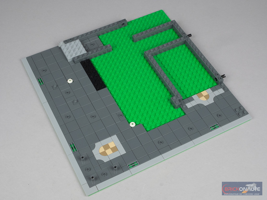 Comme tout bâtiment modulaire LEGO qui se respecte, la construction commence par recouvrir la baseplate de tiles de différentes formes et couleurs pour former le trottoir et le sol des espaces intérieurs du rez-de-chaussée. Remarquez ici le joli motif sur le sol de la mercerie.