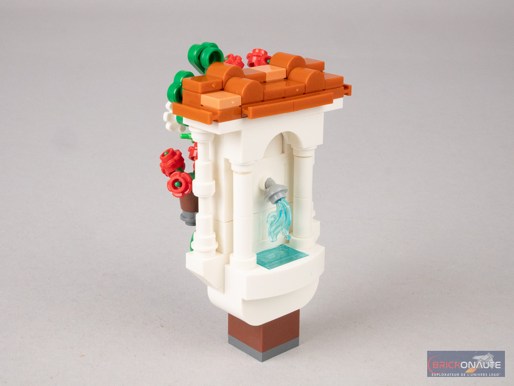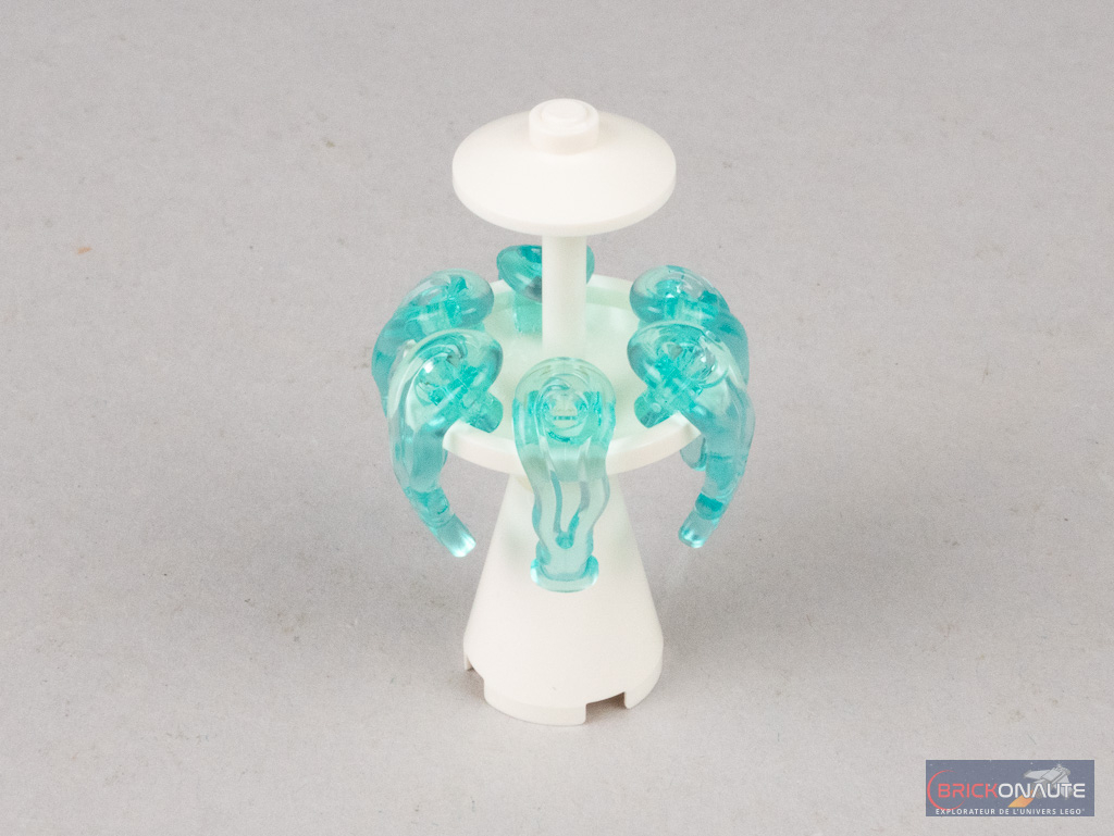 La partie la plus intéressante à construire est sans doute la grande fontaine centrale qui utilise d’une manière astucieuse des pièces destinées habituellement à être tenues en main et lancées par les minifigs (Mini Shooter, w/ 3.2 Shaft). Elles sont ici « coincées » entre deux dishs et le résultat de l’eau qui jaillit est franchement convaincant.