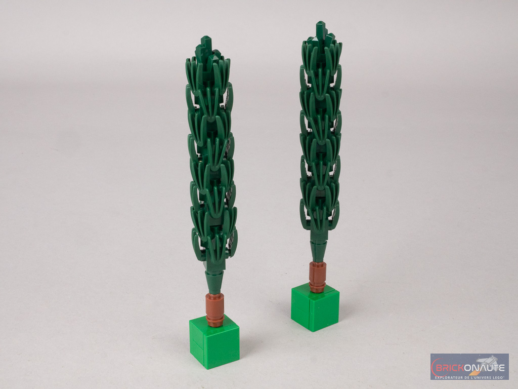 Vous vous en doutez, on va ensuite construire une à une les différentes décorations à insérer dans chacune des 8 réservations prévues à cet effet. Certaines sont très simples, à l’image de la grenouille, de l’oiseau et du banc. D’autres sont nettement plus complexes dont la partie centrale, réversible, avec une fontaine d’un côté et de la végétation de l’autre. Les deux cyprès sont réalisés en superposant des briques SNOT dans lesquelles on intègre des griffes de Wolverine à la verticale. Ce n’est pas passionnant à construire, mais le résultat est sympathique.