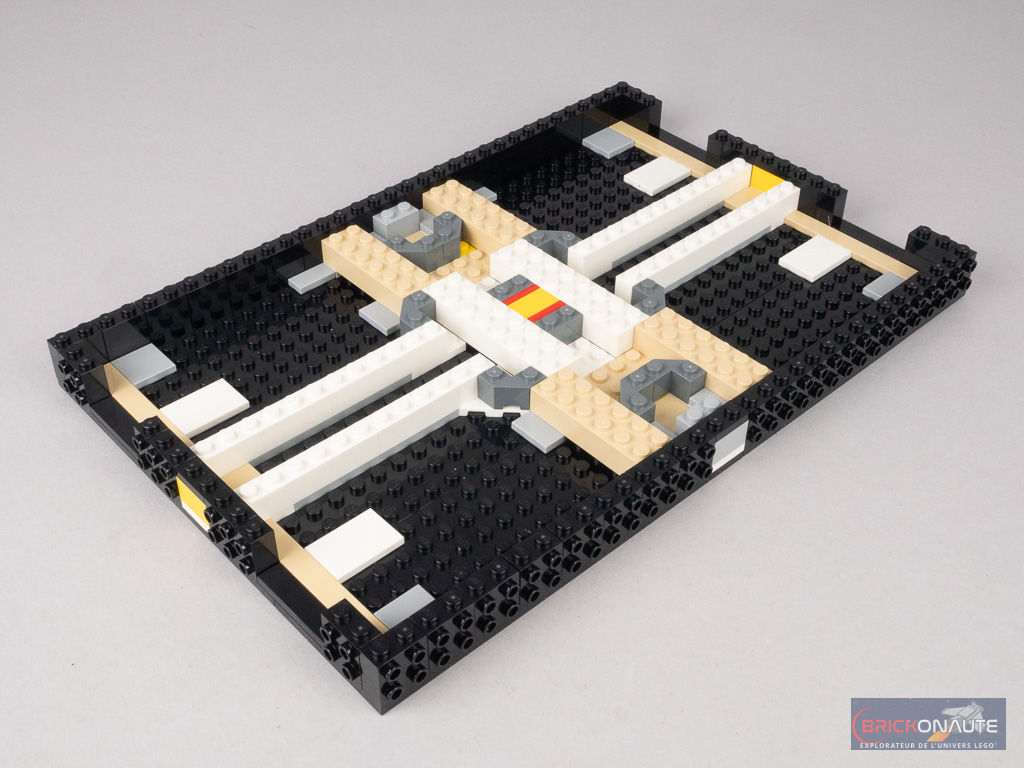 L’assemblage commence par le « bac » qui va recevoir ensuite les différents modules. Le principe est simple : un assemblage de grandes plates et un contour de briques SNOT, avec des encoches sur le côté qui serviront à retirer facilement les modules. On crée ensuite une « croix » à l’intérieur de cette structure qui sera la partie fixe de la construction, avec notamment la fontaine centrale. On y trouve également 4 réservations carrées de 2×2 tenons dans lesquels seront fixées les décorations.