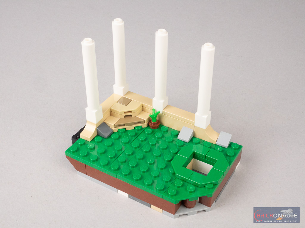 Vous vous en doutez, on va ensuite construire une à une les différentes décorations à insérer dans chacune des 8 réservations prévues à cet effet. Certaines sont très simples, à l’image de la grenouille, de l’oiseau et du banc. D’autres sont nettement plus complexes dont la partie centrale, réversible, avec une fontaine d’un côté et de la végétation de l’autre. Les deux cyprès sont réalisés en superposant des briques SNOT dans lesquelles on intègre des griffes de Wolverine à la verticale. Ce n’est pas passionnant à construire, mais le résultat est sympathique.