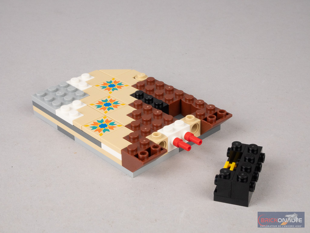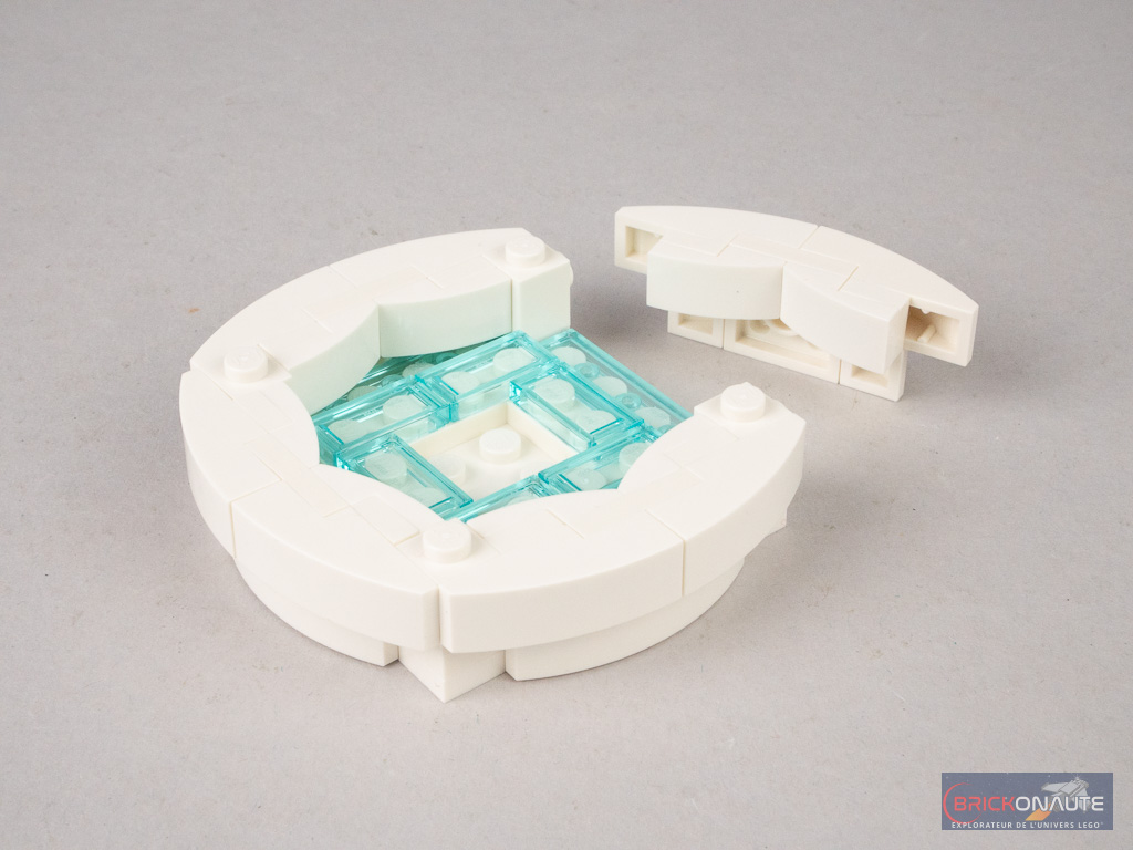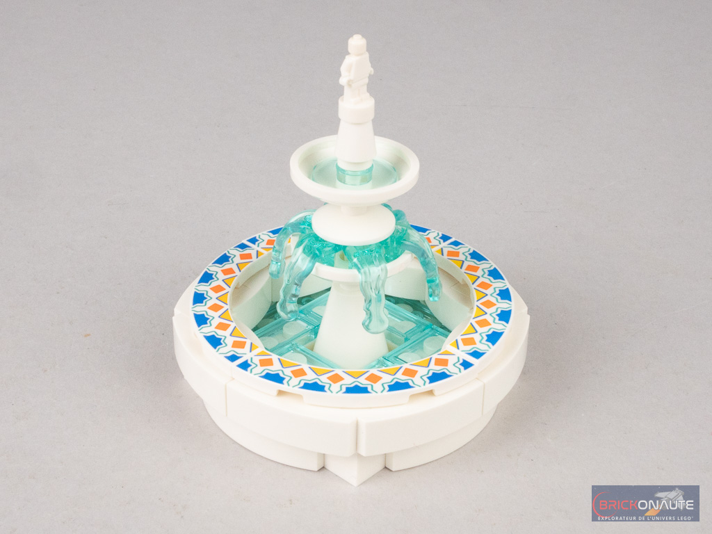 La partie la plus intéressante à construire est sans doute la grande fontaine centrale qui utilise d’une manière astucieuse des pièces destinées habituellement à être tenues en main et lancées par les minifigs (Mini Shooter, w/ 3.2 Shaft). Elles sont ici « coincées » entre deux dishs et le résultat de l’eau qui jaillit est franchement convaincant.