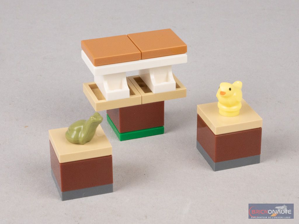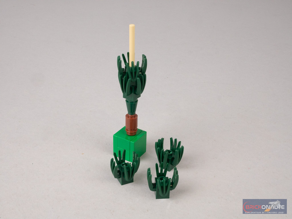 Vous vous en doutez, on va ensuite construire une à une les différentes décorations à insérer dans chacune des 8 réservations prévues à cet effet. Certaines sont très simples, à l’image de la grenouille, de l’oiseau et du banc. D’autres sont nettement plus complexes dont la partie centrale, réversible, avec une fontaine d’un côté et de la végétation de l’autre. Les deux cyprès sont réalisés en superposant des briques SNOT dans lesquelles on intègre des griffes de Wolverine à la verticale. Ce n’est pas passionnant à construire, mais le résultat est sympathique.