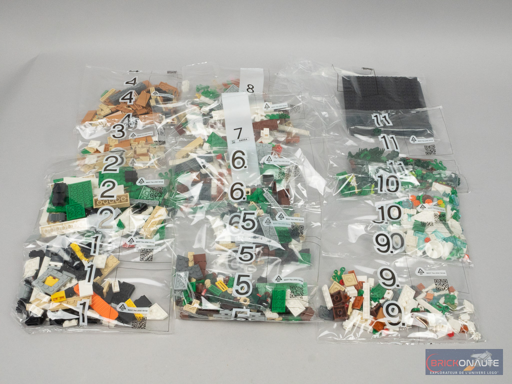 À l’intérieur de la boîte, on trouve 11 sachets de pièces numérotés et un douzième sachet sans numéro avec quelques grandes pièces. Tous ces sachets sont en plastique, la transition vers le papier n’étant pas tout à fait terminée chez LEGO. On trouve également une notice d’instructions de 140 pages qui commence par quelques mots de l’équipe de design et une double page de présentation des éléments du set. La notice est également ponctuée de facts tout au long de la construction, c’est toujours très sympa à lire.