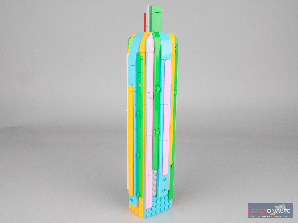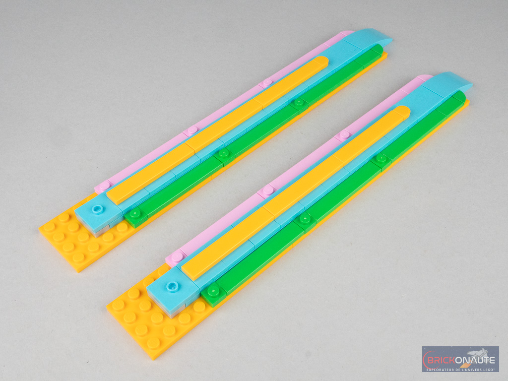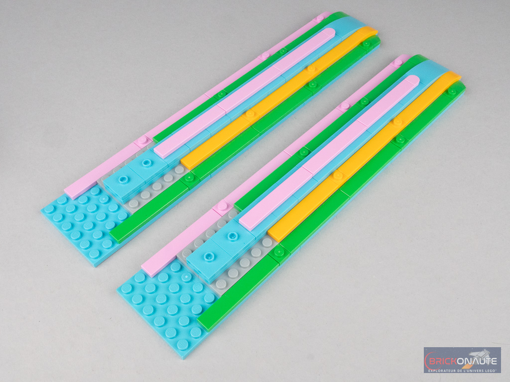 La construction de la grande traînée colorée est elle aussi plutôt simple et commence par l’assemblage d’une structure creuse tout en hauteur avec quelques briques SNOT. On construit ensuite 4 grands panneaux, identiques 2 à 2, qui viennent couvrir cette structure.