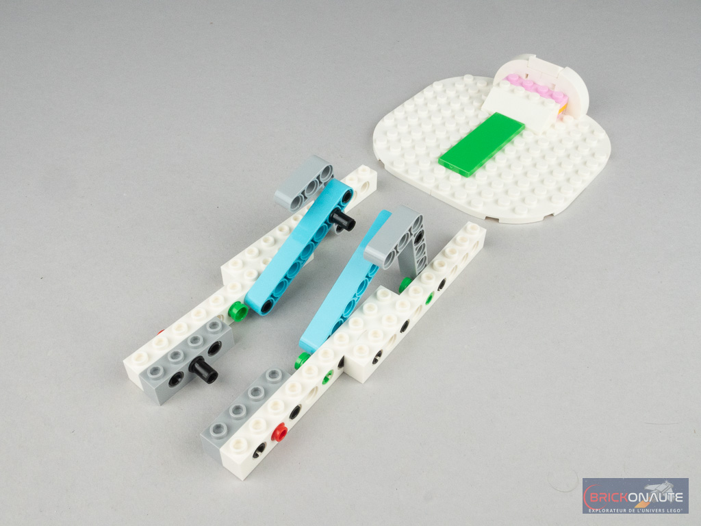 La construction commence par le petit « boulier » qui recevra par la suite les 49 têtes de minifigs. L’assemblage est assez simple avec une base composée de brackets pour fixer la tile tampographiée de l’inscription MY PHRIENDS, et de jumpers pour décaler les colonnes de têtes d’un tenon et demi entre elles. Des briques SNOT couvertes de grandes tiles forment les montants latéraux, et la partie supérieure reçoit elle aussi quelques jumpers pour attacher les deux casques d’astronaute et les minifigs de Pharrell Williams et de son épouse Helen. Les colonnes de têtes seront construites au fur et à mesure de la construction, une colonne étant assemblée à chaque début de sachet pour les 7 sachets de pièces restants.