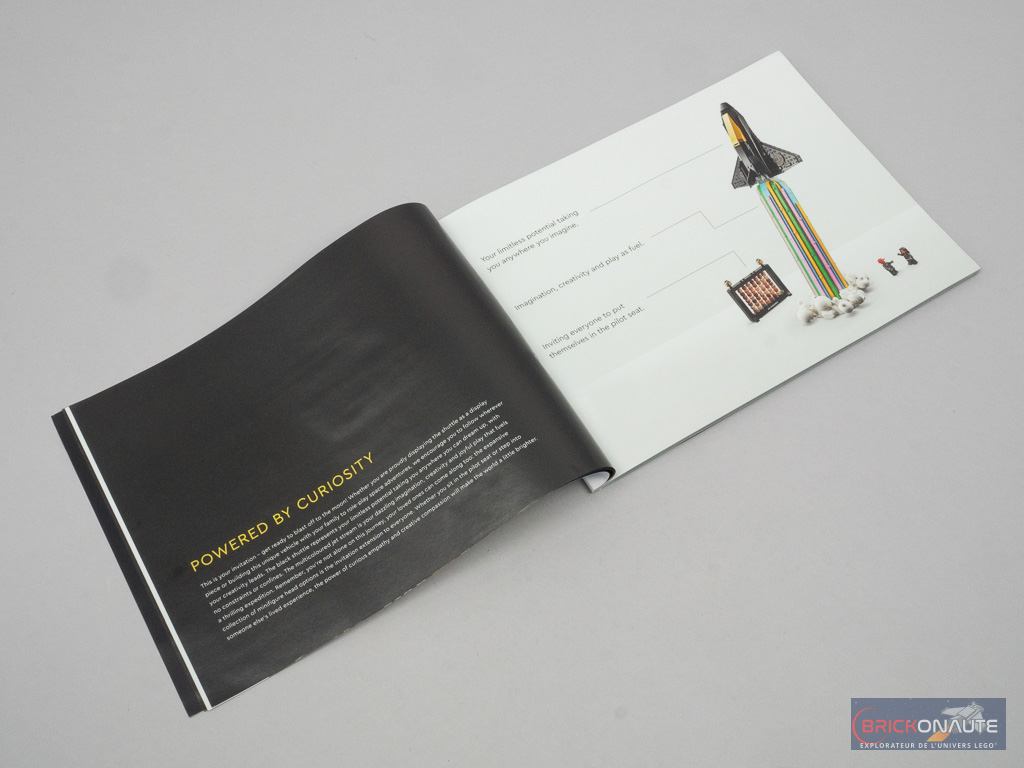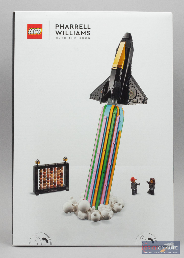On ne voit qu’une partie du set sur la face avant, avec la navette noire et sa traînée colorée sur un fond étoilé – le tout étant traité avec un vernis sélectif. Sur le côte, on trouve une photo de Pharrell Williams accompagnée de la citation « Curiosity is the Life Force in All of Us ». Au dos, le set nous est présenté dans son intégralité, avec les deux minifigs et le « boulier » avec 49 têtes de minifigs dans 7 teintes différentes.