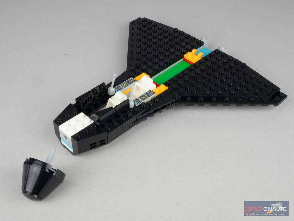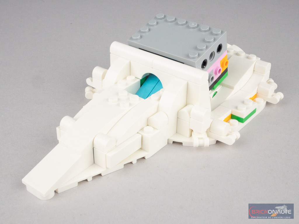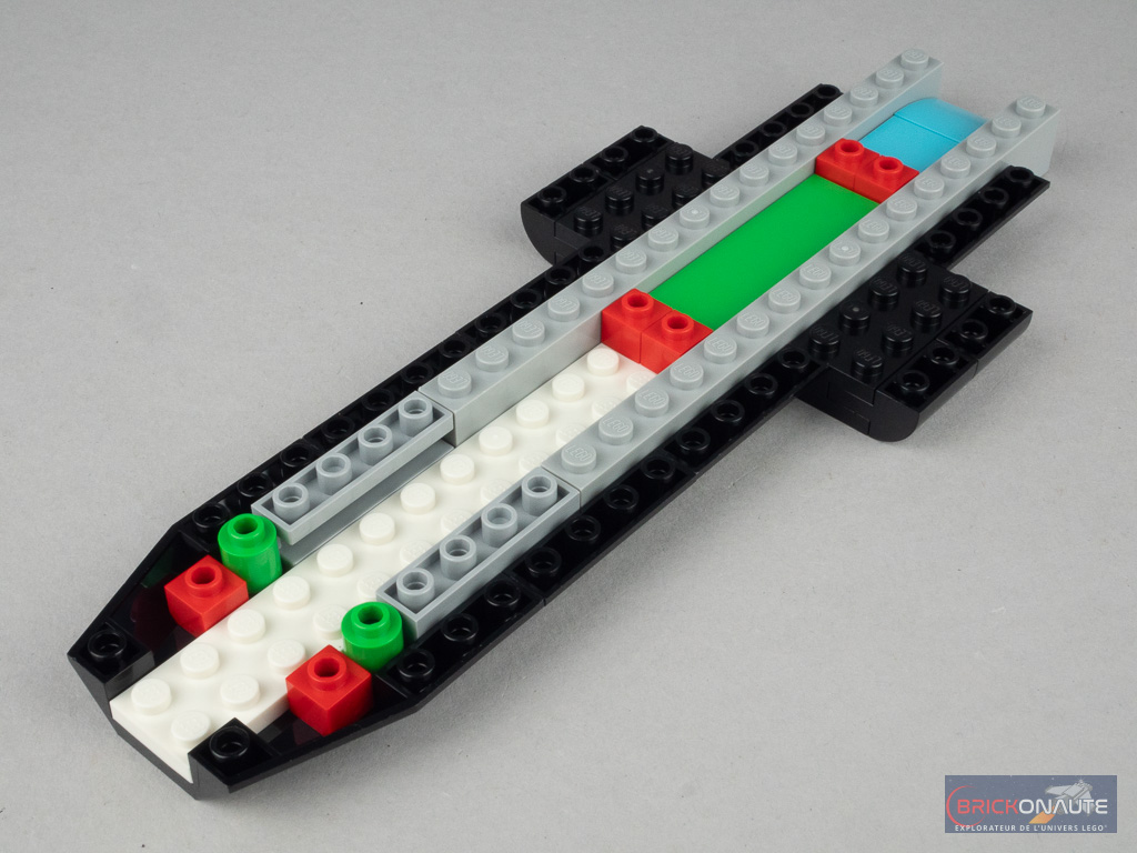 Les sachets 2 et 3 sont dédiés à la construction du vaisseau spatial dont la conception est assez simple. On assemble une structure avec de grandes briques surmontées de wedges de différentes tailles pour lui donner sa forme définitive, les grandes ailes reposant sur des wedges (presque) triangulaires de 10×10 tenons. À l’arrière du vaisseau, des rails et des clips sont installés pour fixer, plus tard, le vaisseau sur la grande traînée colorée. On assemble un petit cockpit avec de la place pour deux minifigs et un petit poste de commande, puis on « ferme » la partie arrière avec de grandes pièces courbes et un aileron. L’angle des moteurs est obtenu grâce à des charnières. L’assemblage se termine avec les trois trains d’atterrissage et la grande verrière dorée.