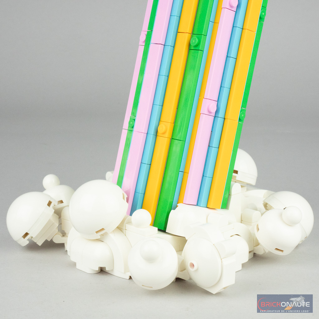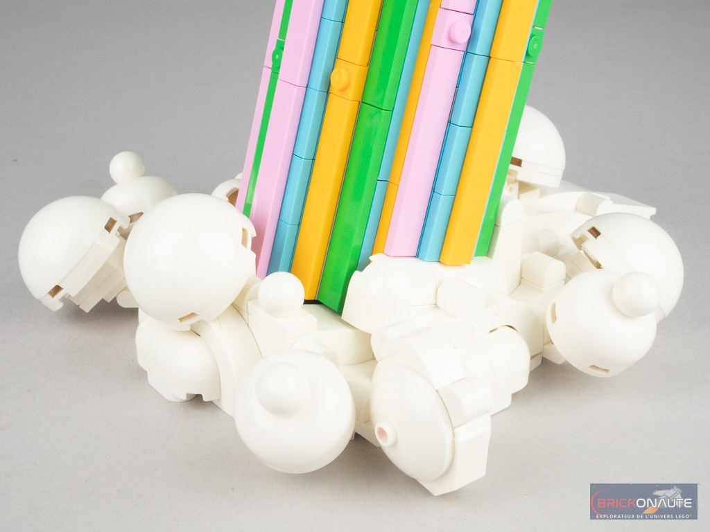 L’étape la plus intéressante de l’assemblage est sans doute celle qui nous propose de construire la base sur laquelle sera fixée cette grande traînée colorée. L’angle désiré est obtenu grâce à une structure Technic interne, qu’on vient renforcer à la base après y avoir attaché le sous-assemblage précédent. La construction se termine avec de nombreuses pièces courbes et autres boules blanches pour former les volutes de fumée – notez que ceux-ci sont ajustables grâce à une fixation sur des clips.