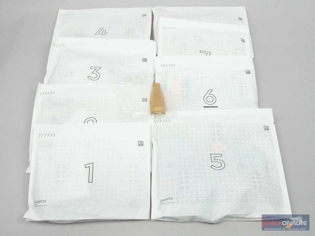 À l’intérieur de la boîte, on trouve 8 sachets de pièces en papier numérotés, et un petit sachet plastique qui contient la verrière dorée – qui sera ainsi protégée des rayures. La notice d’instructions compte 132 pages pour 165 étapes d’assemblage, et commence par quelques pages sur la genèse et les inspirations de ce set. Il n’y a pas le moindre autocollant, toutes les pièces décorées sont tampographiées.