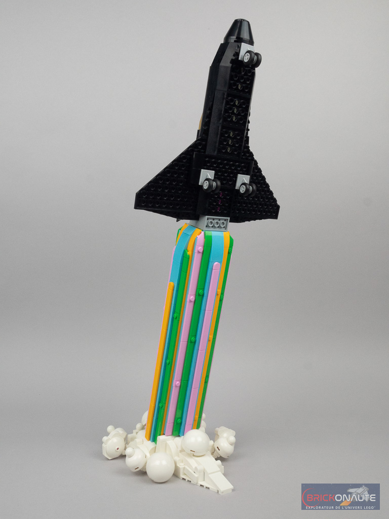 Une grosse partie de l’inventaire est phagocytée par la grande traînée colorée qui permet d’offrir une configuration d’exposition plutôt sympa – même si j’aurais aimé une section plus « arrondie ». Quitte à choisir, je crois que j’aurais préféré des proportions différentes, avec un vaisseau plus grand et plus détaillé digne ce que la gamme LEGO Icons sait proposer, et une traînée plus petite. Car pour être très honnête, celle-ci n’est pas non plus spécialement palpitante à construire.