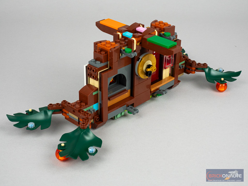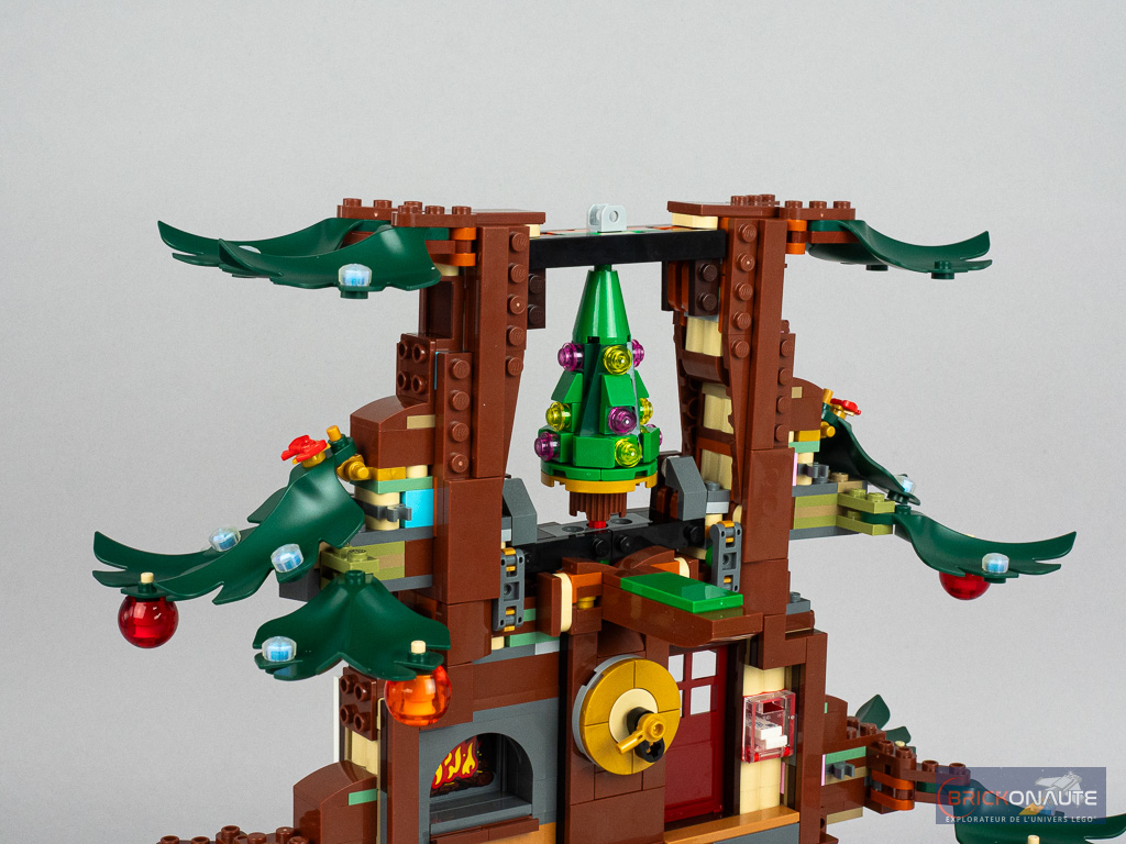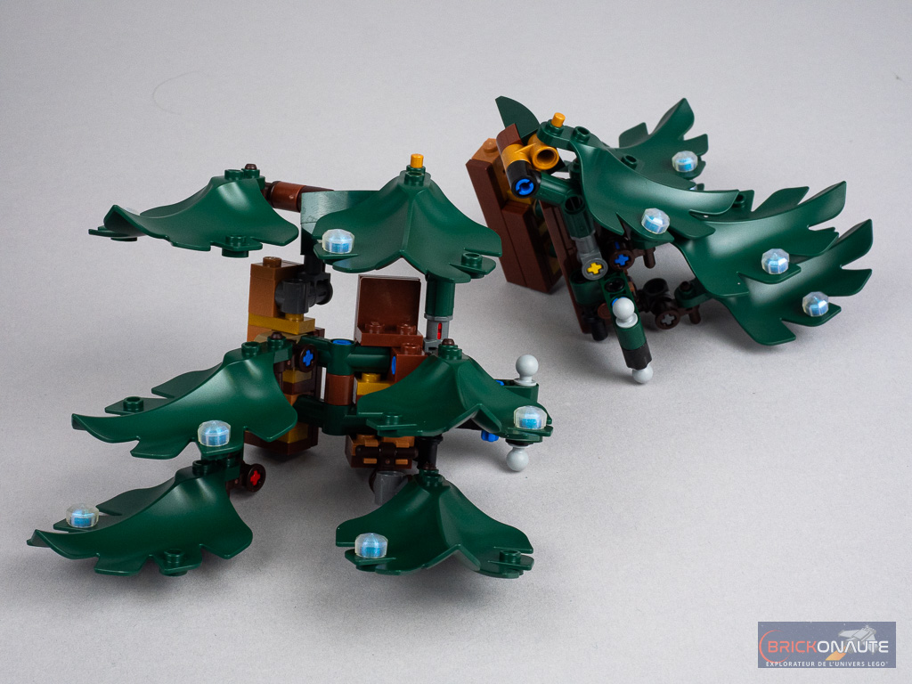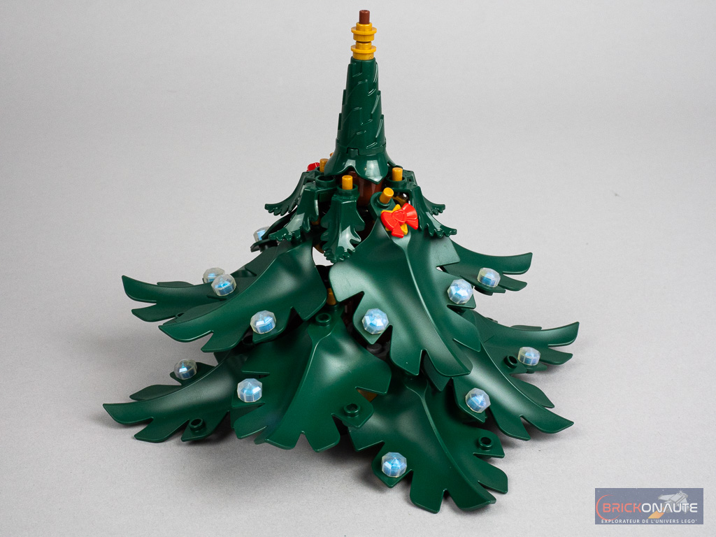 Toutes les feuilles sont individuellement décorées avec de petits éléments opalescents, des étoiles et des petits noeuds rouges, mais on remarquera surtout les grosses boules rouges et oranges translucides qui réemploient des « casques » de minifigs notamment vu dans les sets LEGO Marvel pour Mysterio et recolorés pour l’occasion.