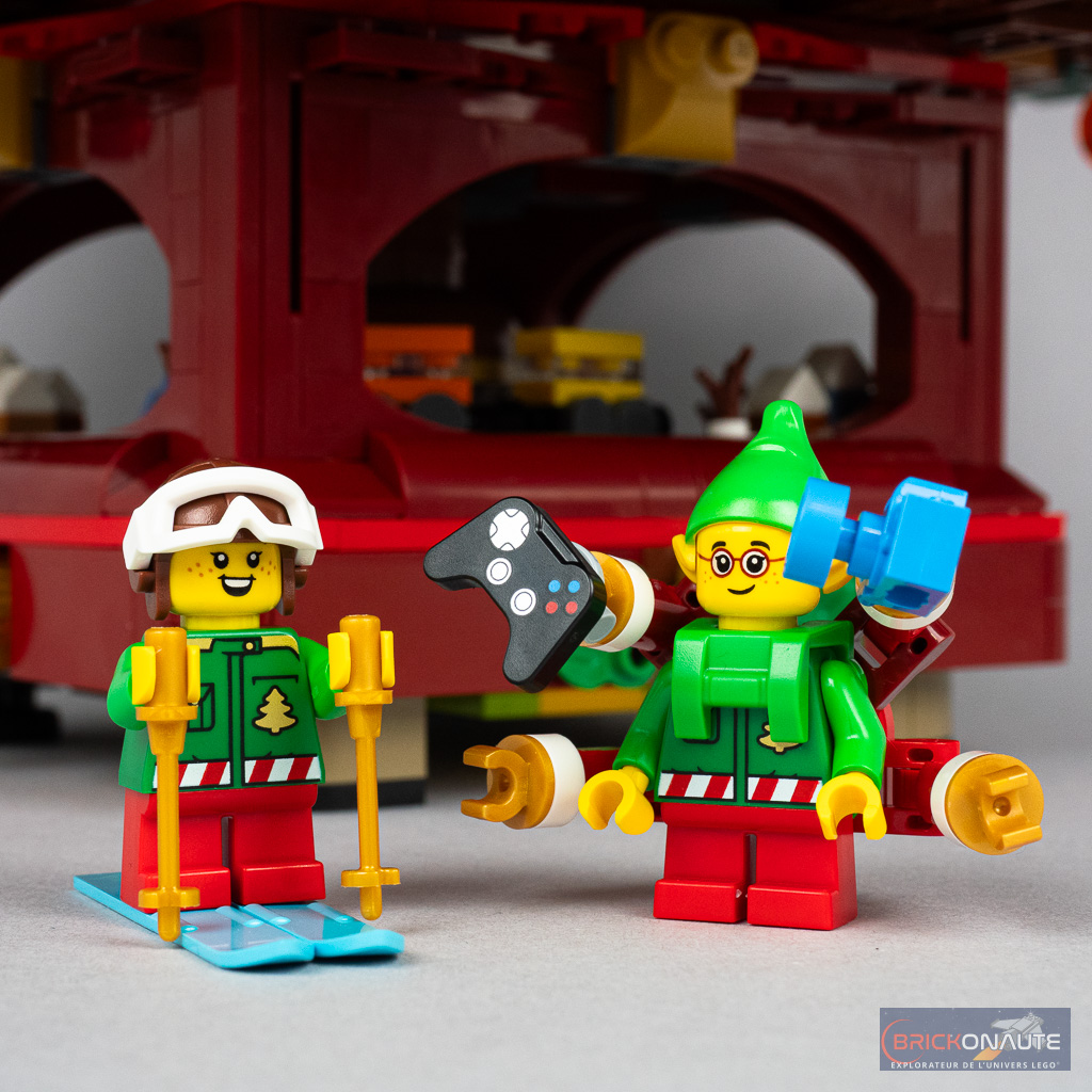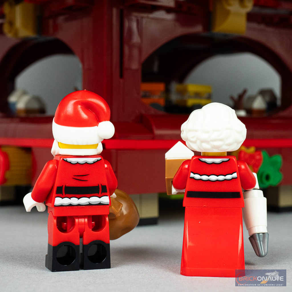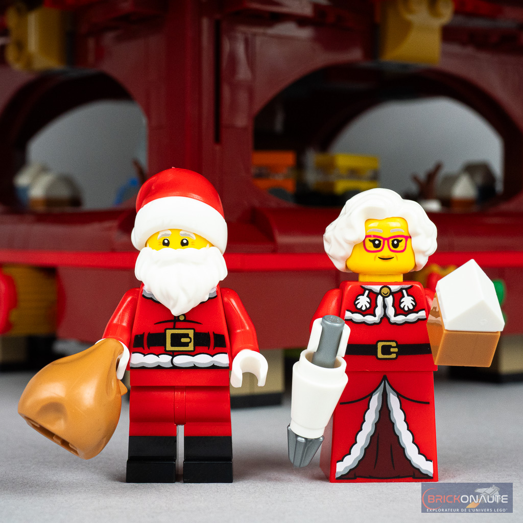 7 personnages sont de la partie avec le Père et la Mère Noël et 5 lutins. Le Père Noël est ici proposé dans une version déjà vue dans d’autres sets, la seule différence majeure étant l’utilisation d’un double moulage pour son chapeau. La Mère Noël, pour sa part, est proposée dans une nouvelle version pour la partie inférieure de sa robe. On remarquera (comme d’habitude…) la tampographie blanche un peu terne sur les éléments rouges, c’est dommage.