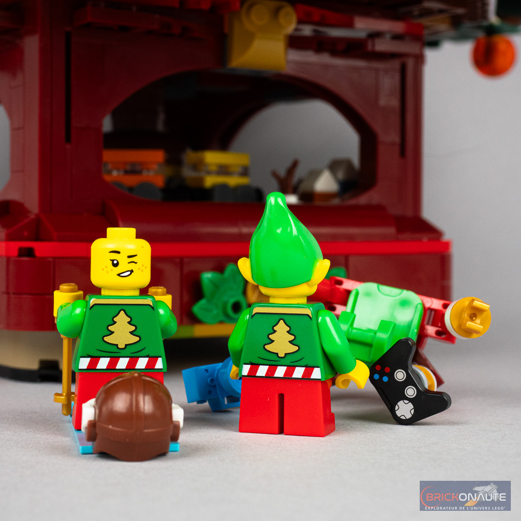 Pour les 5 lutins, LEGO a mis les petits plats dans les grands avec 4 torses totalement nouveaux. Parmi les pulls moches de Noël, on retrouve la tête de Chapristi mais surtout une version remaniée du logo Classic Space avec un traîneau à la place du vaisseau spatial. Parmi les accessoires notables, les fans apprécieront surtout le casque et les bouteilles d’air en bright green, ou le harnais façon Docteur Octopus.