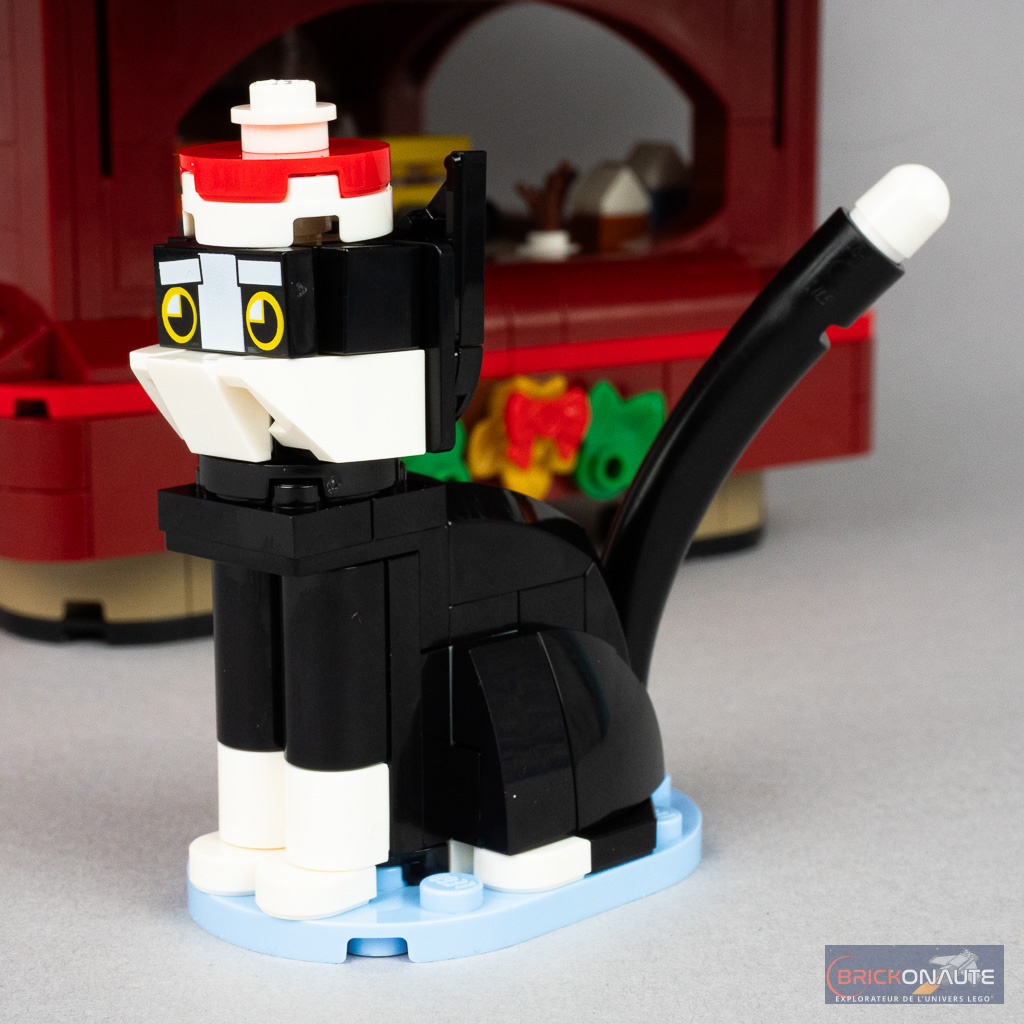 Il y a également deux constructions annexes avec en premier lieu de traîneau et son renne, sorte de mini-version du set 40499 Santa’s Sleigh sorti en 2001. C’est propre mais peut-être un peu minimaliste. LEGO nous propose également de construire Chapristi (Cataclaws), un chat brick-built vu dans les communications publicitaires récentes de la marque.