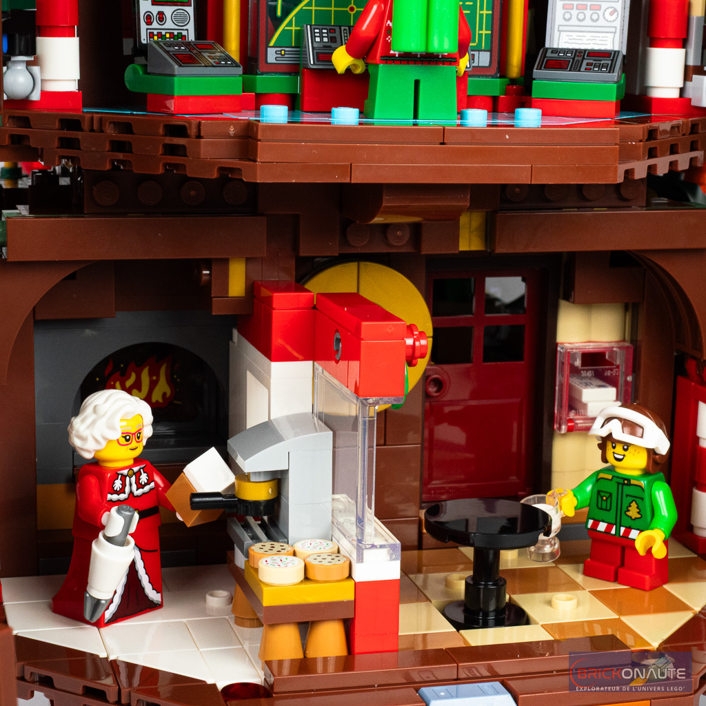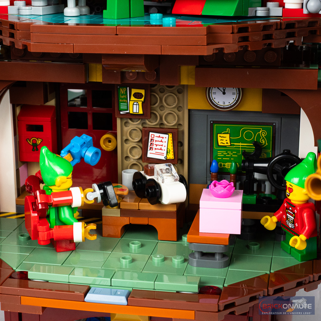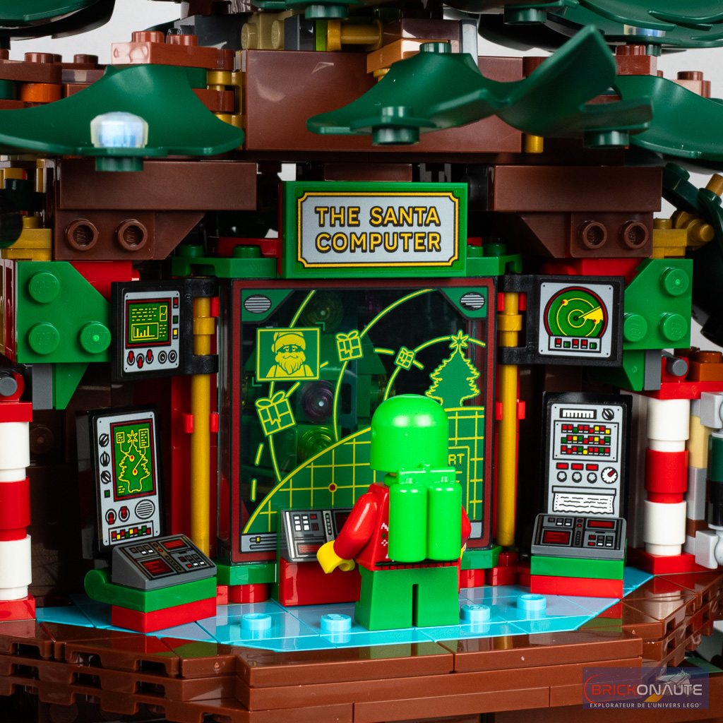 L’intérieur du sapin est aménagé sur deux niveaux différents, et des deux côtés de la construction. Il est accessible en ouvrant les « panneaux » de feuilles et on y trouve un cuisine et une cantine, un atelier pour les lutins, une salle de contrôle et une salle de pause. Tout ceci regorge de détail avec une machine à café, un four, une boîte aux lettres un atelier de peinture, une machine à coudre, un flipper, des bornes d’arcade et même le Santa Computer et ses panneaux de contrôle pour planifier le parcours du Père Noël le grand soir.