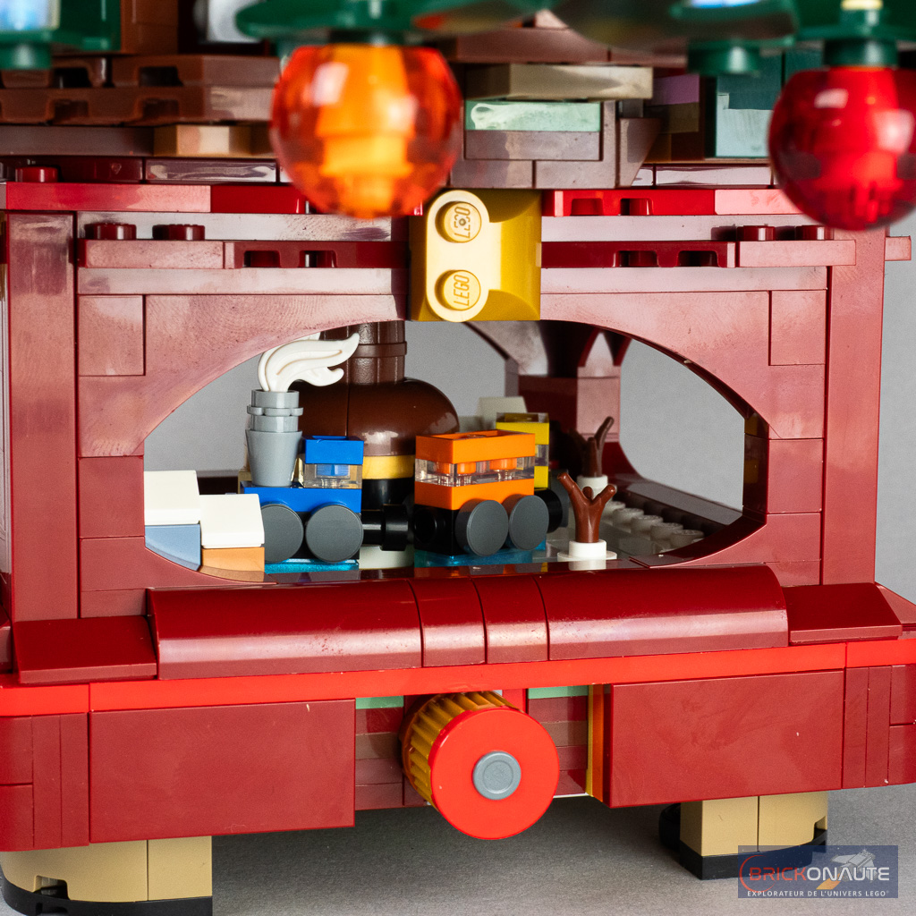 Le socle est également très joli dans sa couleur dark red avec quelques accents rouges et dorés. Il est creux et laisse apparaître à l’intérieur une micro scène hivernale avec un train qui tourne autour de l’axe de la construction en faisant tourner les molettes.