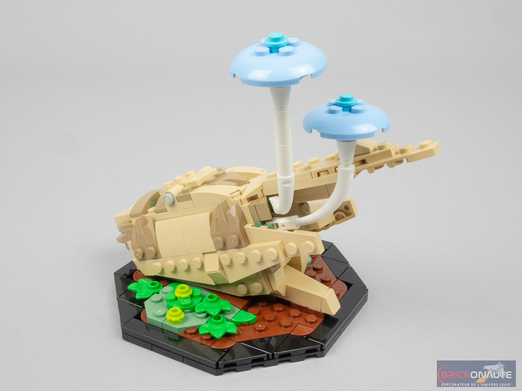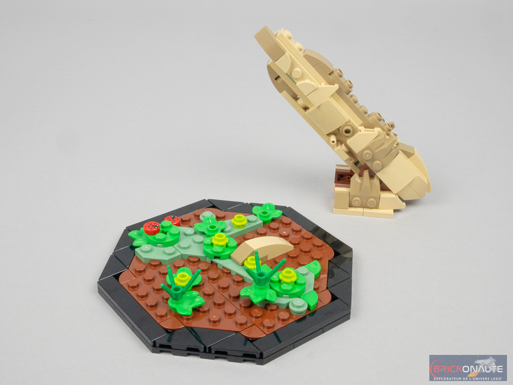 Les couleurs sont bien choisies, même si j’ai du mal à comprendre cette pièce jaune à la base du cou. Les différents connecteurs, pour le support et l’animal, savent se faire discrets. On retrouve également 3 petites coccinelles (de simples round tiles tampographiées) sur le support, un petit ajout sympathique qui ne manquera pas d’être réutilisé dans de nombreux MOCs.