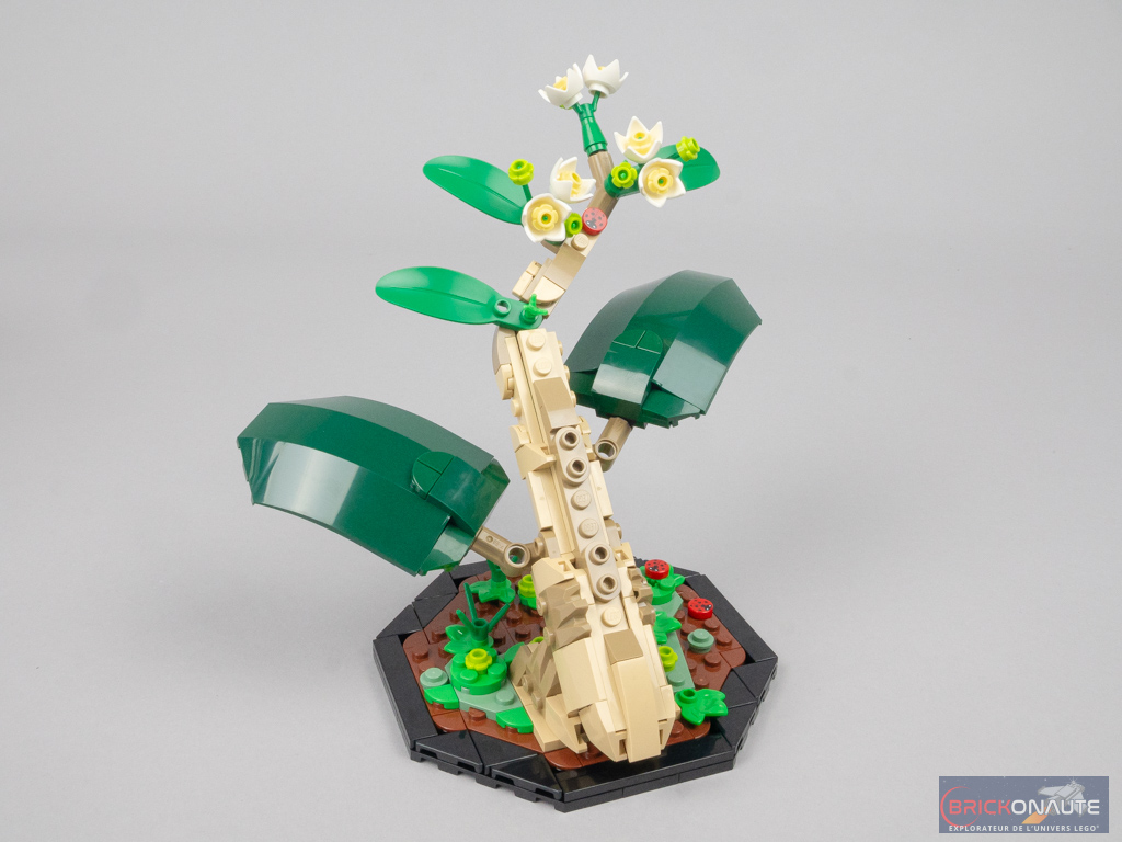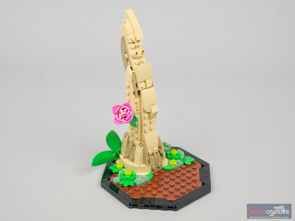 Vous l’aurez deviné, on commence cette dernière construction par un support d’exposition octogonal identiques aux deux premiers. On construit alors une structure à base d’éléments SNOT qui formera la branche sur laquelle se pose notre mante chinoise, puis on la fixe grâce à des pièces en angle au socle. Là encore, en partie supérieure, des connecteurs Technic permettent de fixer la partie supérieure de la branche avec l’angle souhaité. On termine cette étape avec quelques fleurs.