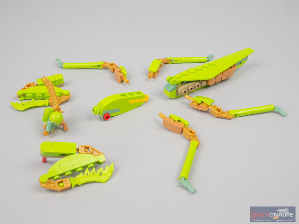 Cette dernière construction est à l’avenant des 2 précédentes : c’est encore une fois très réussi. On retrouve bien la silhouette filiforme de la mante chinoise et cet aspect presque « fragile » qui la caractérise. Pour une fois, il est bon de le préciser, je n’ai pas décelé de différences notables de teinte entre les éléments couleur lime – habituellement sujette à ce genre de problèmes.