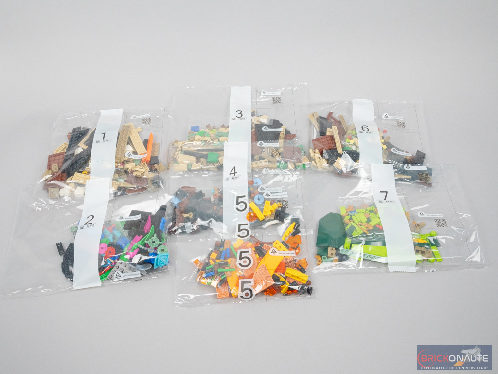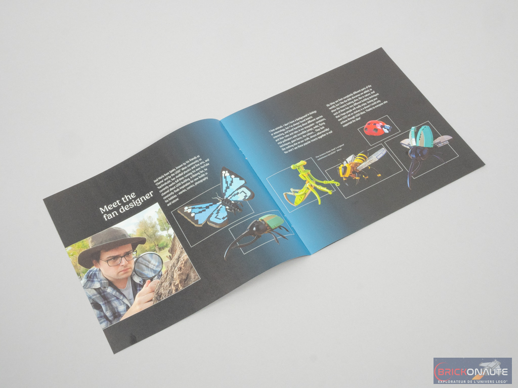 À l’intérieur, on trouve 7 sachets de pièces numérotés et une pochette en carton contenant 4 notices d’instructions. Les 3 premières sont dédiées à chacun des 3 insectes, et la dernière ne contient aucune instruction (je crois que c’est la première fois que je vois ça) mais une présentation du set, des designers LEGO (Jordan David Scott et Kirsten Bay Nielsen) et du fan designer José Maria, et des différentes bestioles. Il n’y a pas, heureusement, le moindre autocollant dans cette boîte.