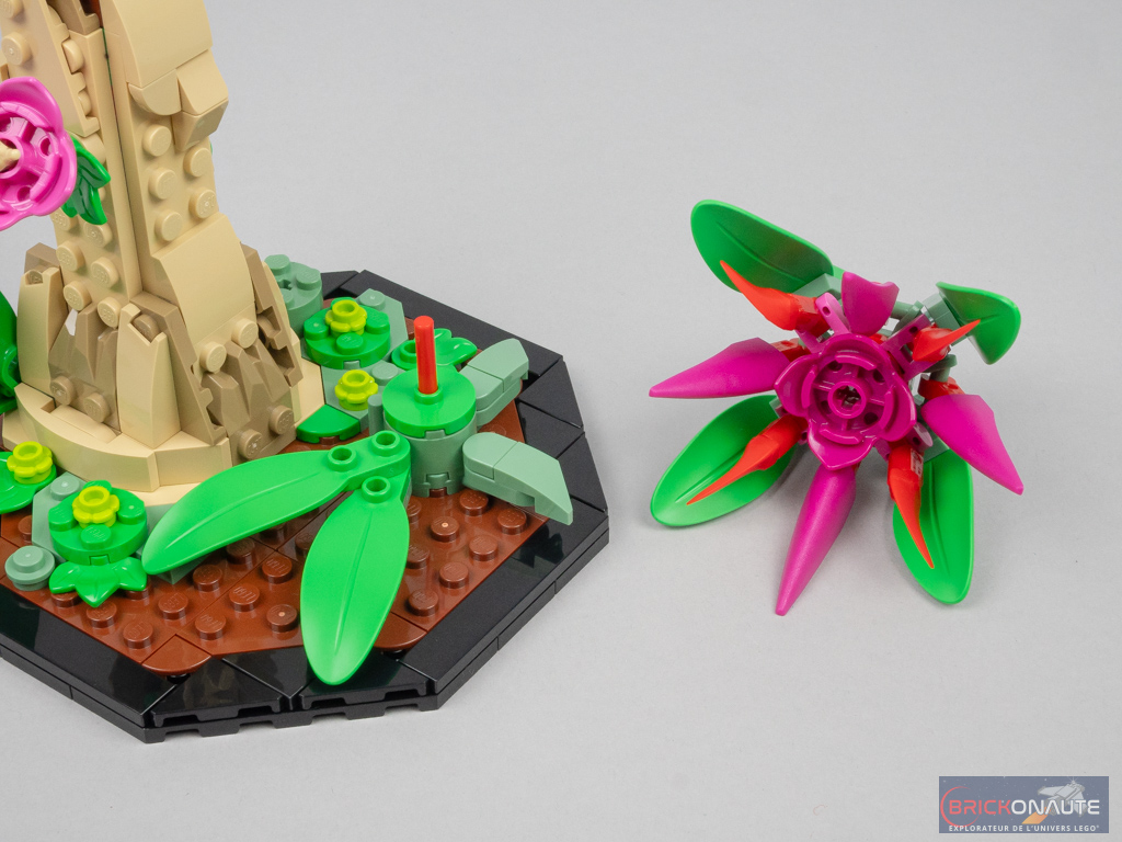 On continue avec une jolie fleur qui nous rappellerait presque la Botanical Collection dans son design et les techniques de construction – il s’agit ici d’une broméliacée. On passe alors à la construction du papillon à proprement parler. Les ailes se décomposent en deux sous-ensembles, articulés entre eux par une charnière pour trouver l’angle adéquat. Les deux ailes sont clipsées au corps – et sont donc mobiles. On ajoute également une jolie petite abeille, fixée sur une tige courbe transparente.