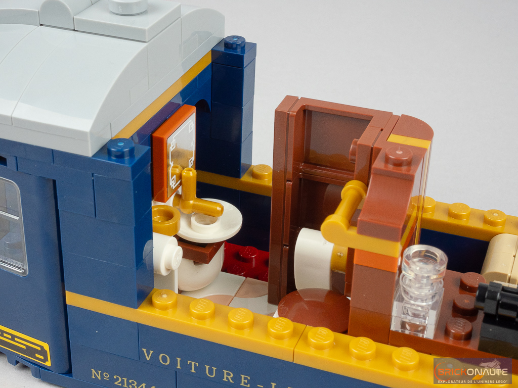 La seconde cabine est nettement plus grande – il s’agit d’une cabine de première classe. On y trouve un grand lit 2 places surmonté d’un miroir convexe et entouré de deux petites lampes (qu’on retrouve d’ailleurs en photo sur le site officiel de l’Orient Express), ainsi qu’un canapé et un bureau avec une machine à écrire (peut-être une référence au set LEGO Ideas 21327 Typewriter). On y trouve aussi une véritable salle d’eau. Celle-ci est un petit bijou avec un sol joliment décoré, des toilettes, un porte-serviette, une vasque ou encore un porte-savon.