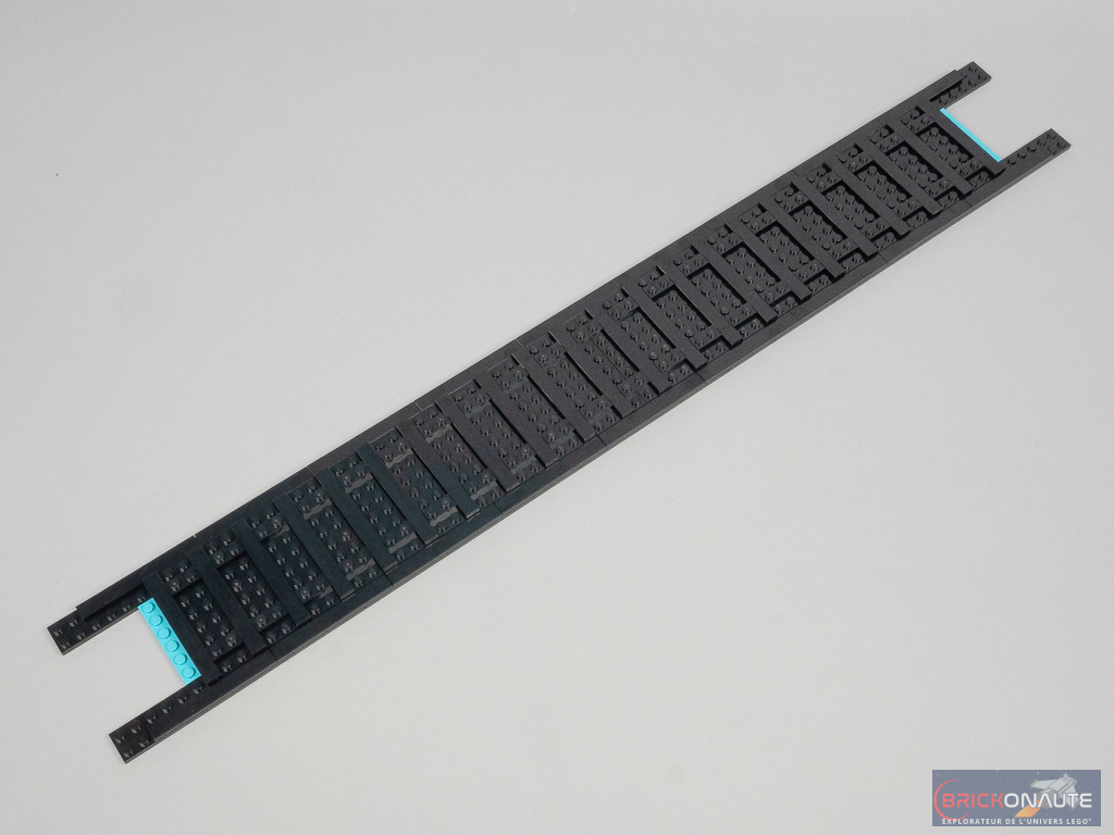 Les deux premiers sachets de pièces (et une bonne partie des pièces présentes dans les sachets non numérotés) sont dédiés à la construction de la portion de voie ferrée. Vous l’aurez deviné, ce n’est pas passionnant à construire mais ultra répétitif – heureusement ça ne prend pas bien longtemps. On construit ici une base de plates noires entourées de tiles, couverte de traverses noires (des tiles également). On termine cet ensemble de presque 1,17m de long (comme prévu, mon studio est trop petit !) avec 18 morceaux de rail.