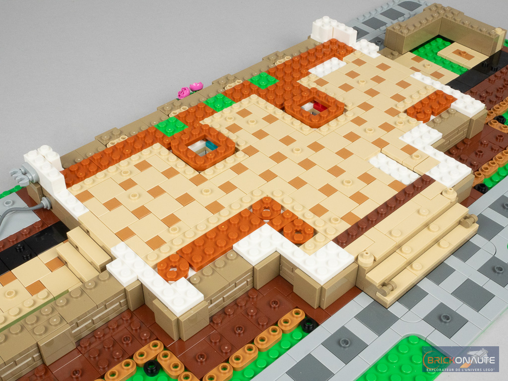 Les premières étapes de construction ne sont pas des plus passionnantes. Après avoir connecté les deux baseplates de 32 tenons de large, on pave le sol de la zone aride, du café, de la terrasse et du trottoir, et on surélève la grande partie centrale qui sera accessible par 3 escaliers différents. Remarquez à ce stade les deux réservations qui permettront d’insérer les deux grands arbres en fin de construction. Le travail des soubassements est malgré tout de très bonne facture, mêlant briques texturées et tiles posées à la verticale.