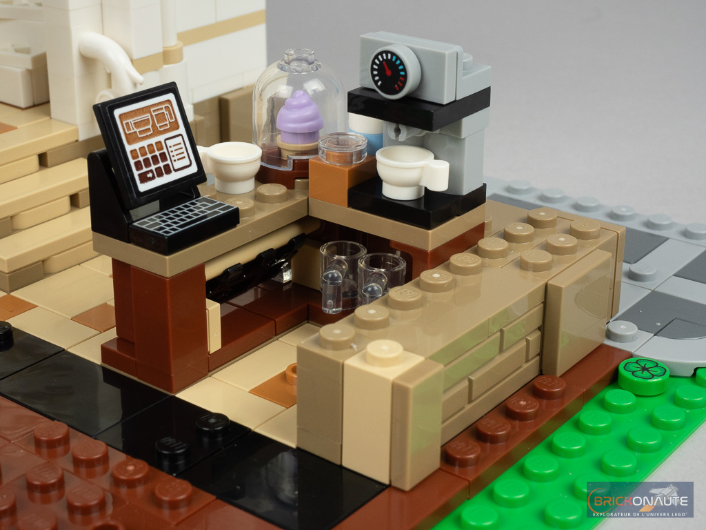 Direction le café, sur la partie droite en regardant le bâtiment de face, où on assemble un petit comptoir avec quelques gourmandises en vitrine et une machine à expresso. On assemble ensuite le mur « fixe » de cette partie avec ses colonnes (plus petites que celles de la partie centrale), ses vitres, ses arches et une porte d’accès depuis la terrasse. Une rangée de tiles avec quelques tenons en partie supérieure permettra le démontage facile du toit. On construit le mur côté entrée, une dernière arche constituant une porte pour l’accès au café depuis la serre centrale. On s’occupe ensuite des plates-bandes extérieures avec des roses et des tulipes, on ajoute également des petites bornes lumineuses.