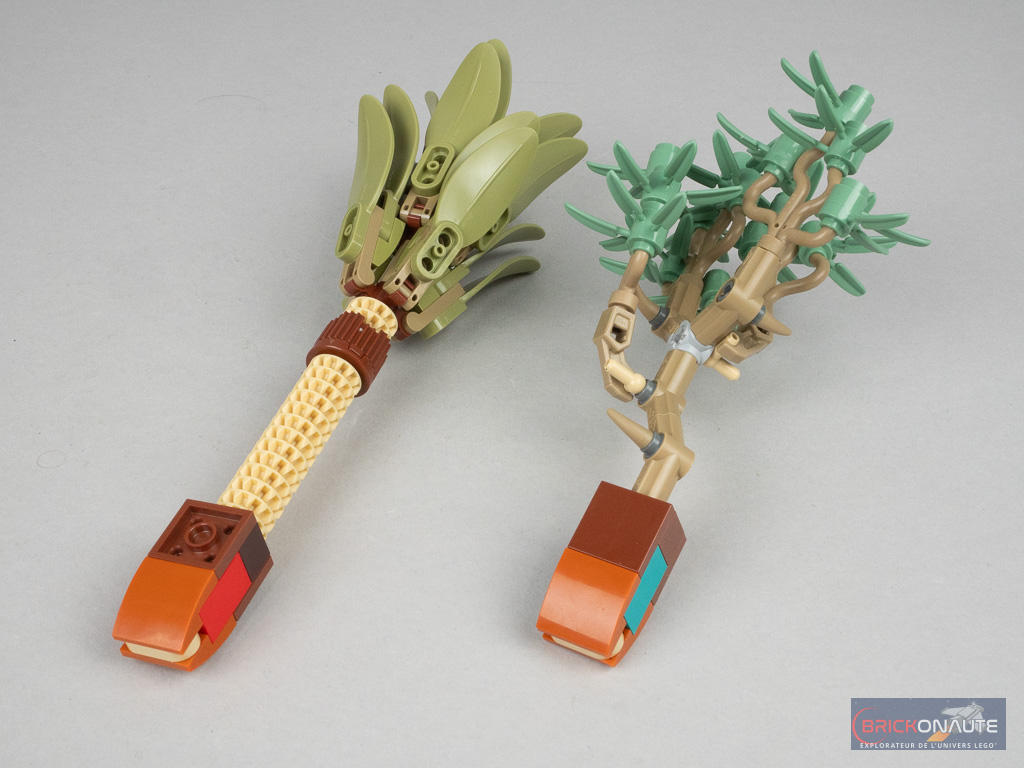 Vous l’aurez remarqué, il manque encore deux végétaux à l’intérieur de la partie centrale – ceux pour lesquels nous avons laissé des réservations lors des étapes précédentes. Dans un premier temps, on construit un eucalyptus qui fait un usage intéressant, en guise de branches, de pièces qui servent habituellement d’algues dans les environnements sous-marins. Quelques clips permettent d’ajuster les branches. On assemble également un palmier dattier avec des engrenages Technic en guise de tronc, et un feuillage clipsé sur deux niveaux à la structure. Un code couleur au pied des arbres (teal ou rouge) permet de ne pas se tromper au moment de les « planter » : ils ne sont pas interchangeables, puisque le feuillage du palmier vient se loger sous la partie haute du toit.