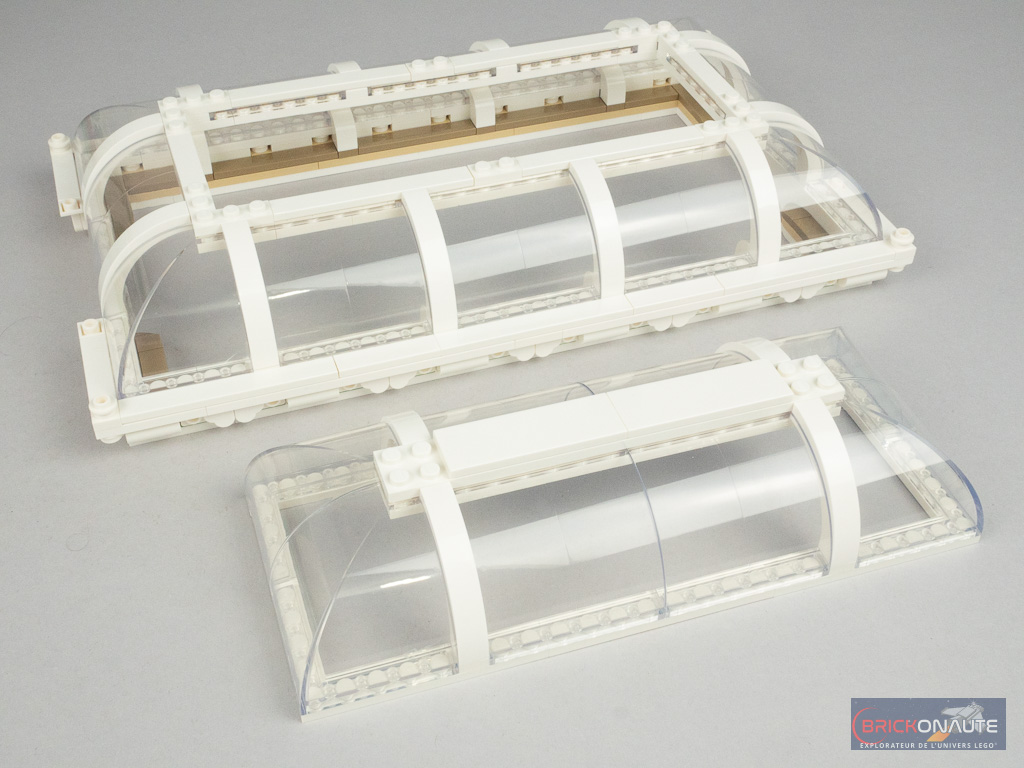 Les équipes LEGO Ideas et le designer Chris McVeigh ont pris le parti d’un projet plus ambitieux que le projet original de la fan designer Valentina Bima. Et personnellement, je trouve ce choix plutôt avisé : cette longueur de 64 tenons (51cm de large) permet d’obtenir un bâtiment élancé, avec des proportions plus proches de l’idée qu’on se fait des serres de style victorien qu’on peut trouver dans les jardins botaniques.