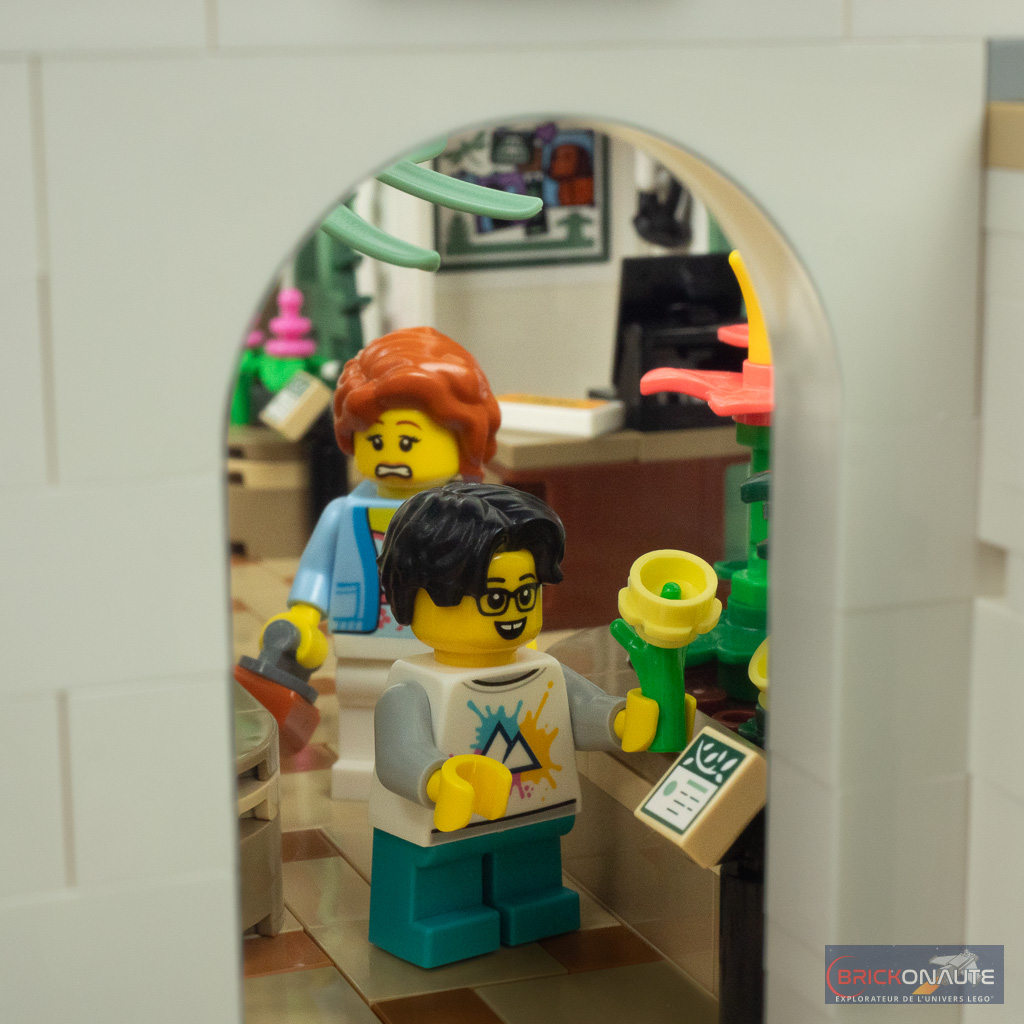 Cette grande taille permet aussi à l’intérieur de « respirer », offrant à la fois de larges jardinières mais également un espace de visite suffisamment grand pour que les minifigs puissent s’y balader. Notez que toutes les façades sont traitées avec le même soin, le jardin botanique étant observable à 360°. Le code couleur blanc et sand green est identique à celui du set LEGO Friends 41757 Botanical Garden, malgré une architecture sensiblement différente – je ne doute pas que certains s’amuseront à combiner ces deux boîtes.