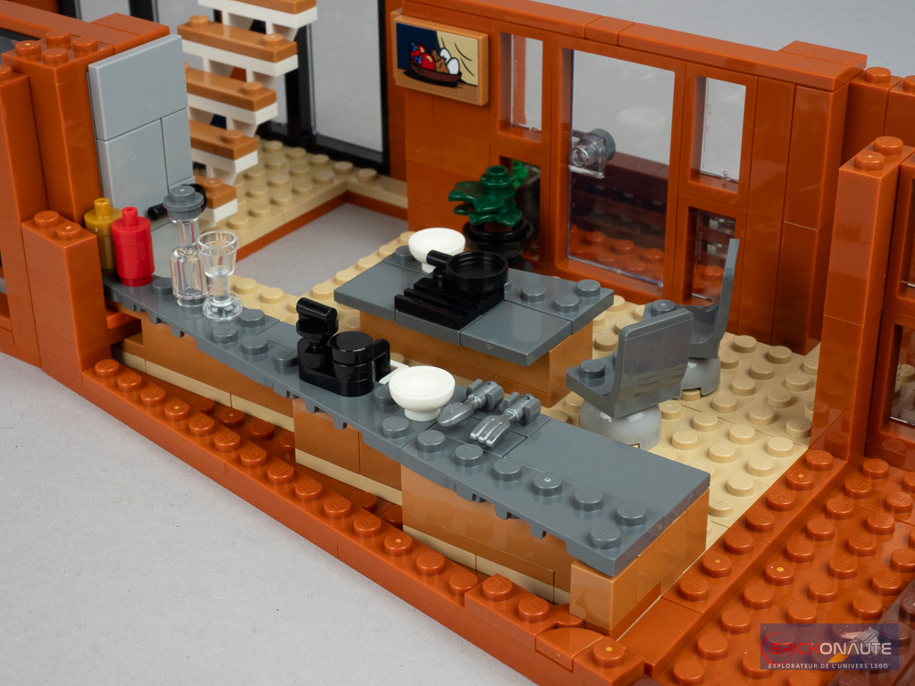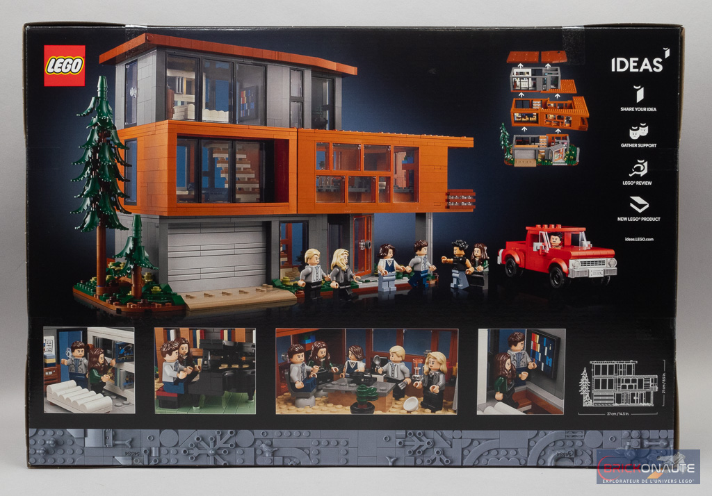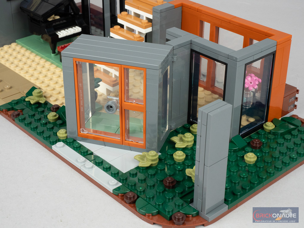 L’interprétation de LEGO en est une version simplifiée mais qui me semble néanmoins plus raccord avec le bâtiment original que le projet proposé sur la plateforme LEGO Ideas. Si on a souvent tendance à se plaindre de « l’adaptation » faite par les designers LEGO des projets de fans, pour le coup je trouve qu’elle était plutôt salutaire. L’aspect très lumineux de la maison avec ses grandes surfaces vitrées est bien retranscrit, et le choix de couleurs me paraît adapté. Autre qualité notable, le bâtiment peut-être observé sous tous les angles, l’arrière étant tout aussi travaillé que l’avant.