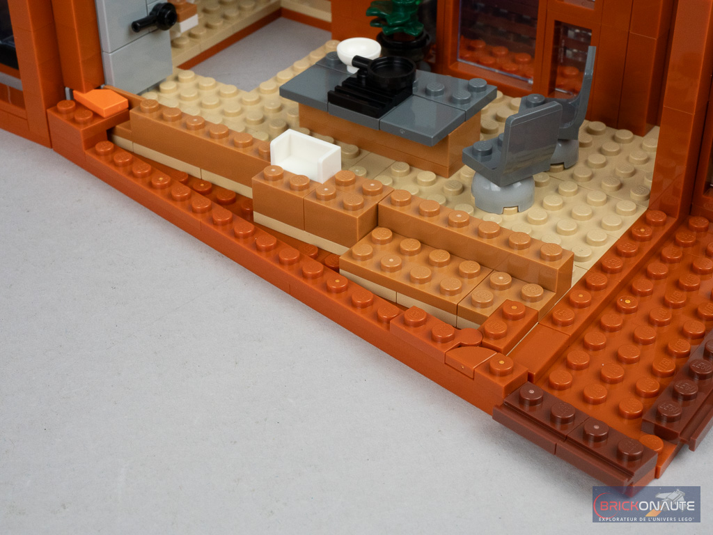 Ce n’est pas parfait non plus, loin de là. On remarquera plusieurs différences majeures avec le bâtiment de référence, et notamment ce porte-à-faux et cette terrasse en pignon, nettement plus restreints sur la version LEGO – probablement pour des raisons de stabilité de la construction. Au 2ème étage, le toit censé se prolonger s’arrête aussi au raz du bâtiment. D’une manière générale, le bâtiment est beaucoup plus « ramassé » que son alter ego cinématographique.